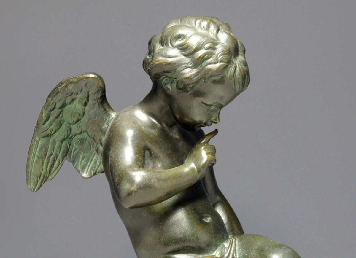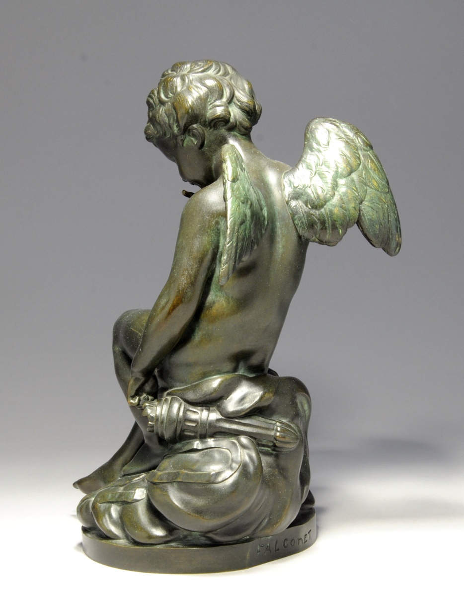 d'après FALCONNET (1716 - 1791)L'amour menaçant. Bronze à patine verte,...