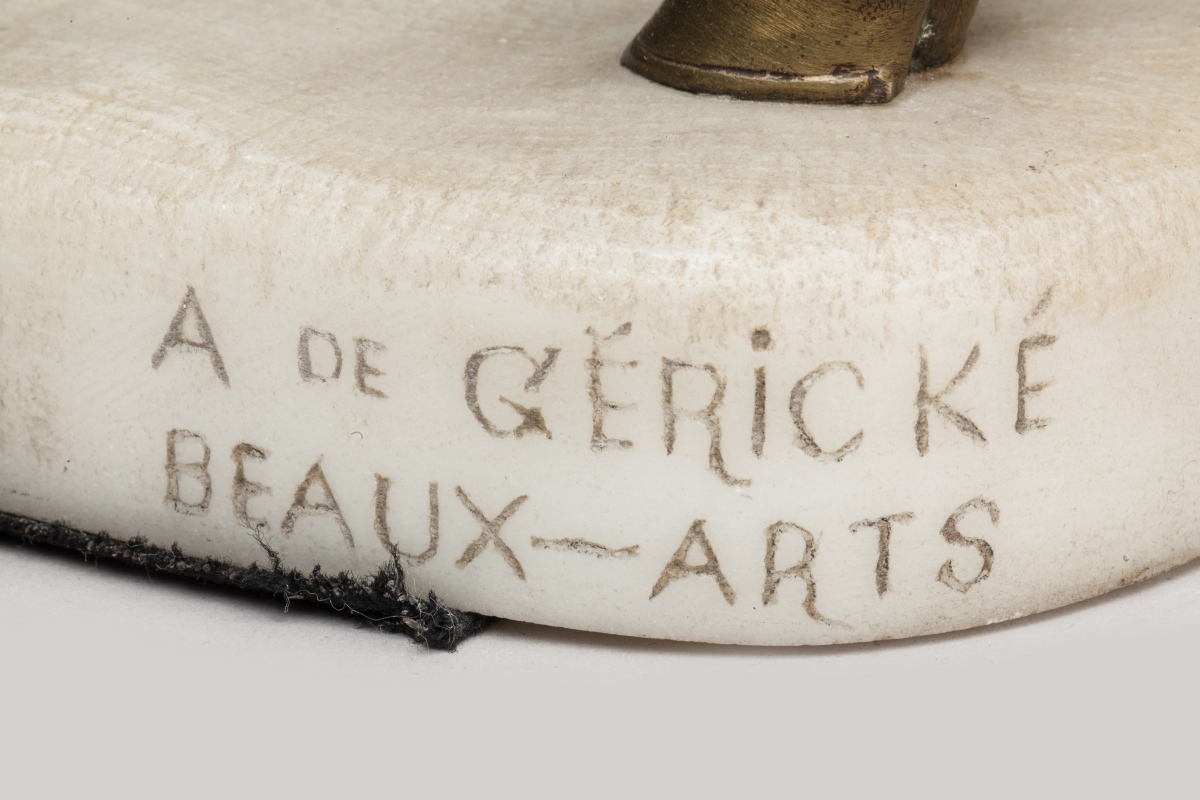 Signé sur une base en mabre blanc également gravée (beaux-arts), titrée sur une plaque en métal.