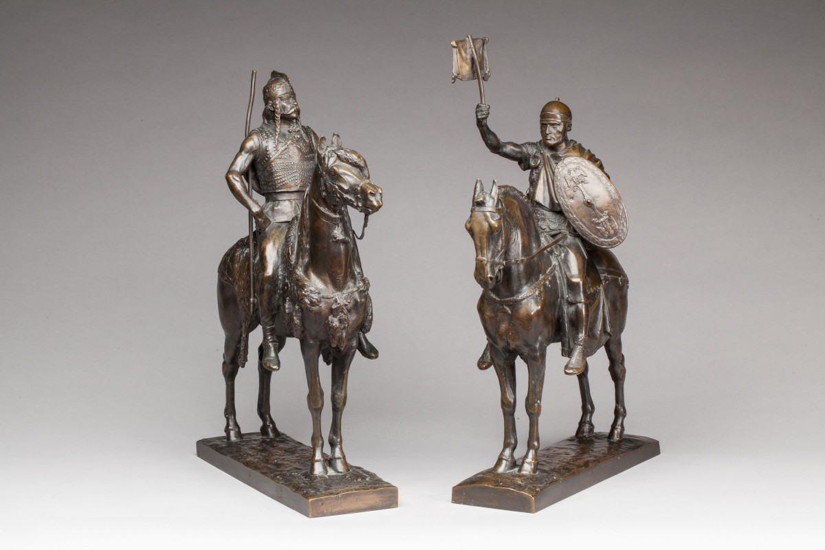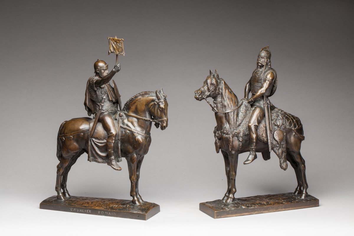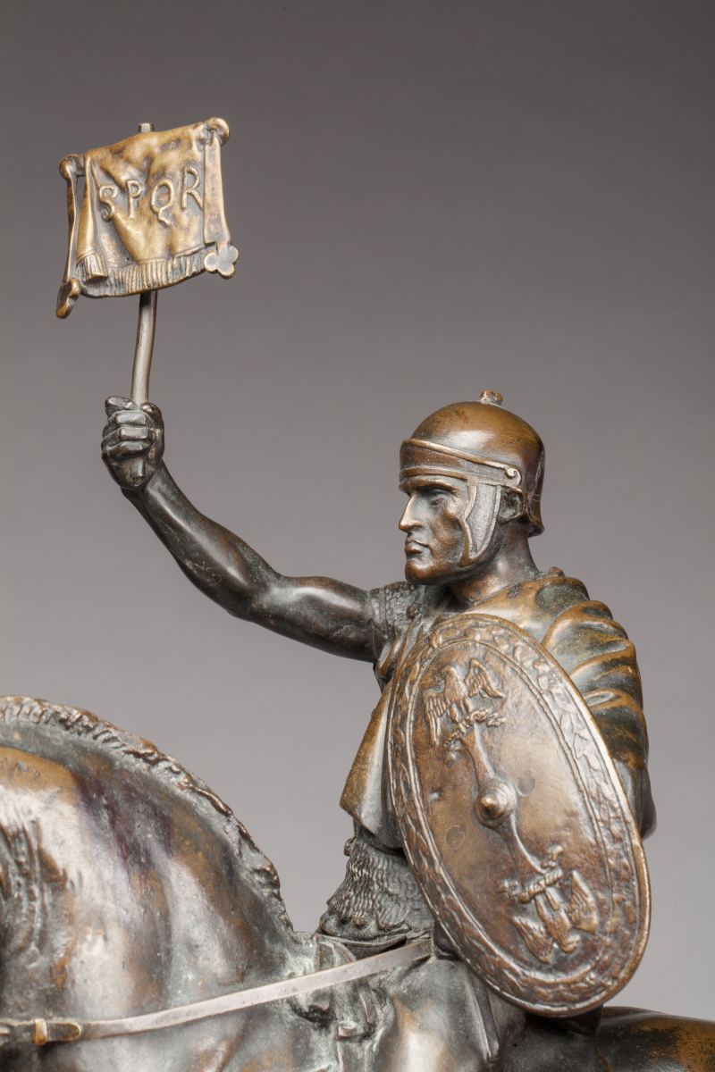 Haut. 39, Long. 27, Larg. 8 cm. (lance changée ou manquante, pied droit du cavalier romain accidenté)