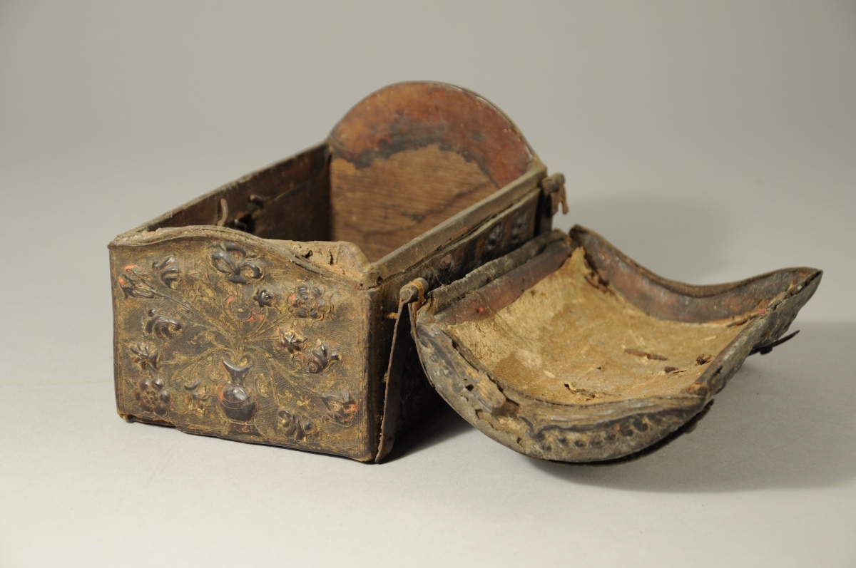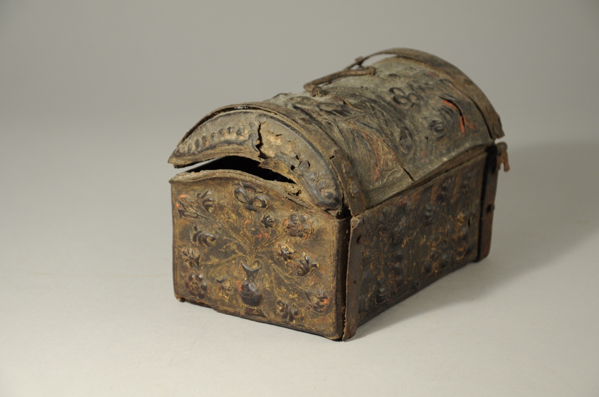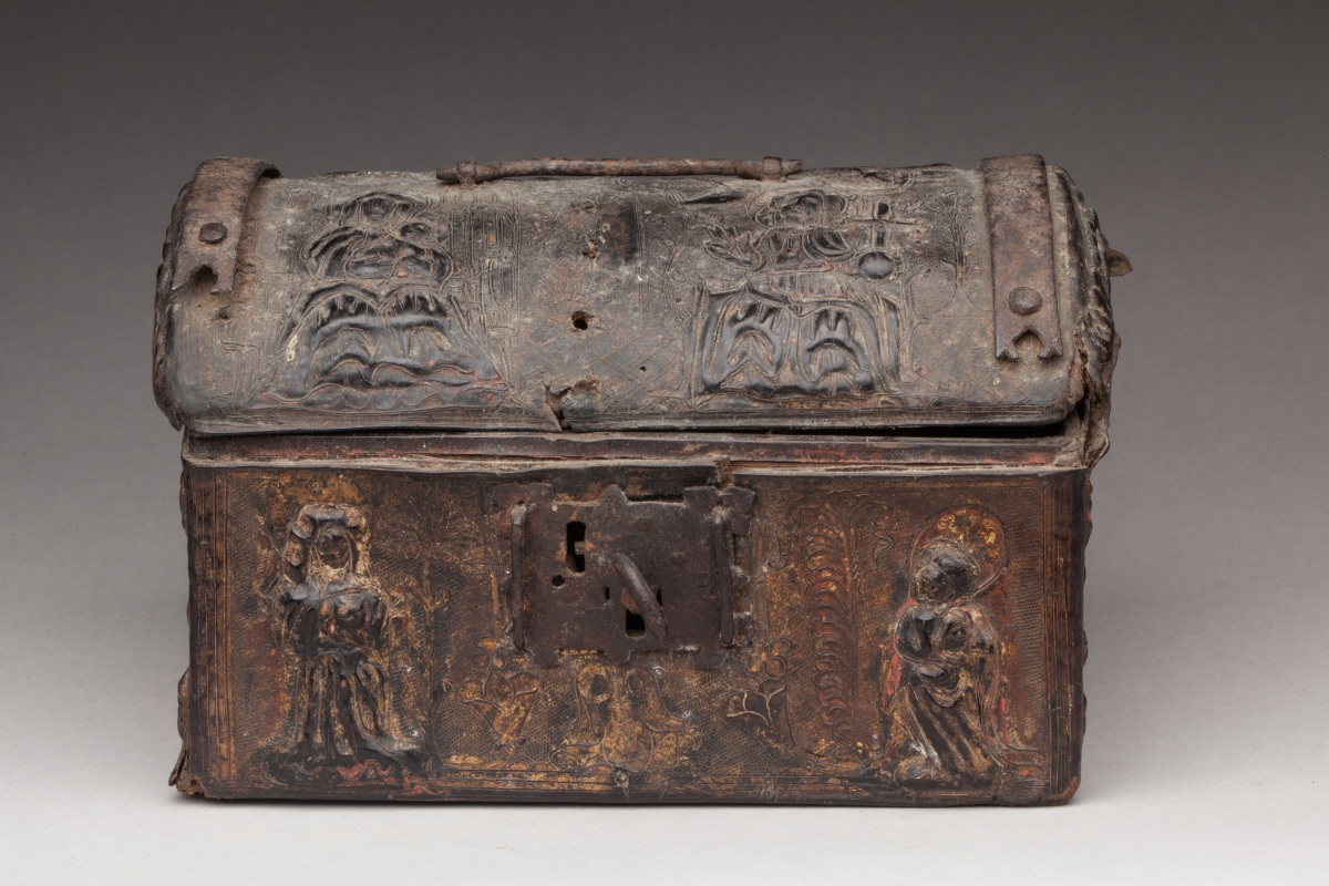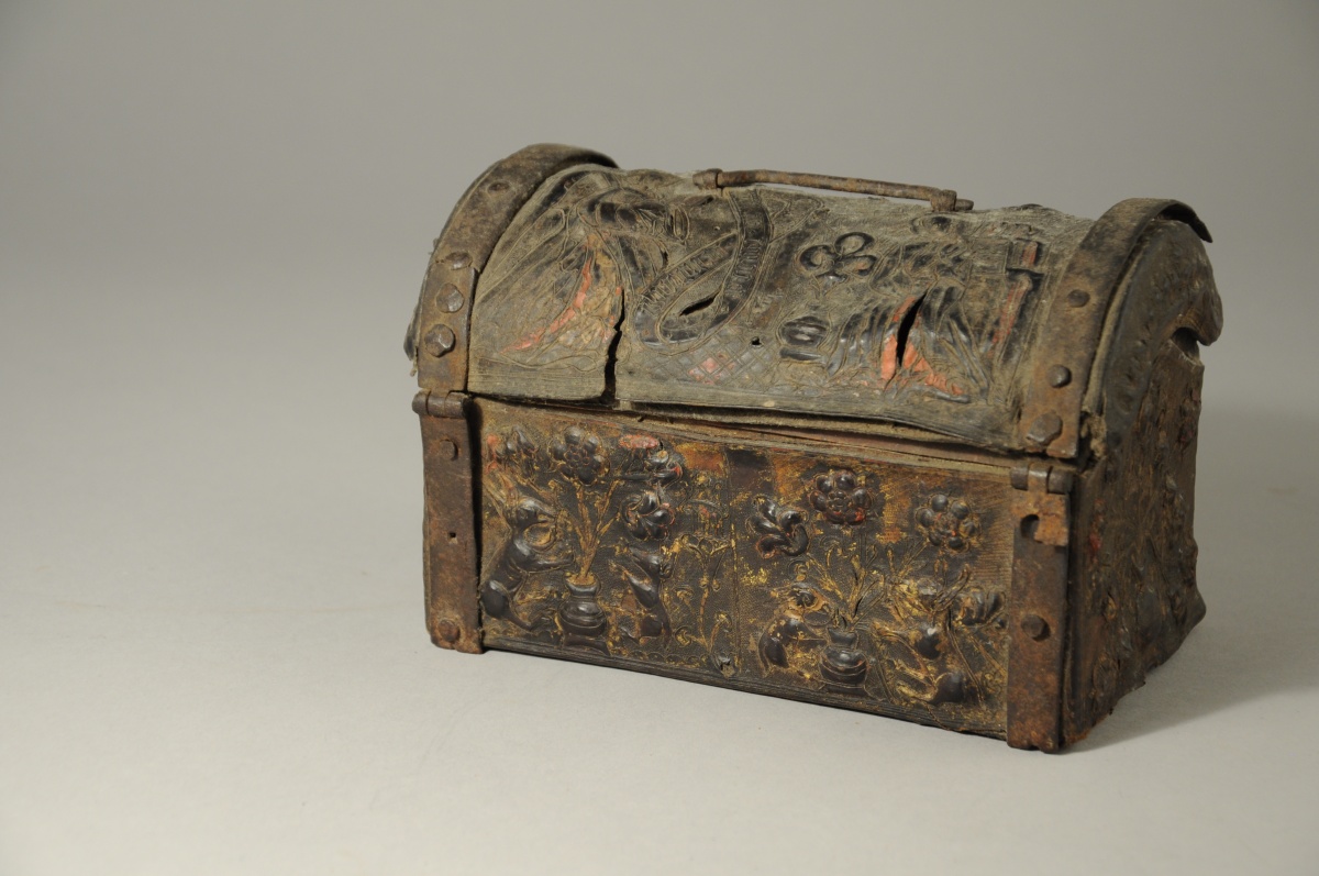COFFRET rectangulaire à dossier bombé. Âme de bois recouverte de cuir estampé et gauffré de saints personnages, bouquets fleuris, encadrés de lapins ? Belle scène de l'Annonciation, portant une inscription gothique. Anciennement polychrome et or, traces. Prise de couvercle, clous et serrure en métal.