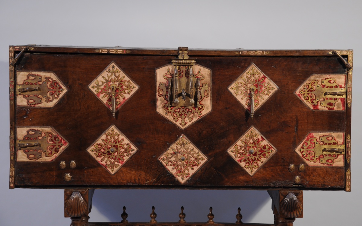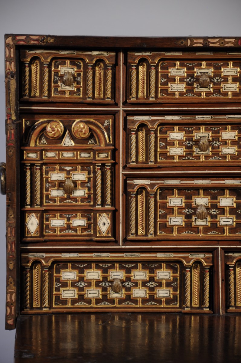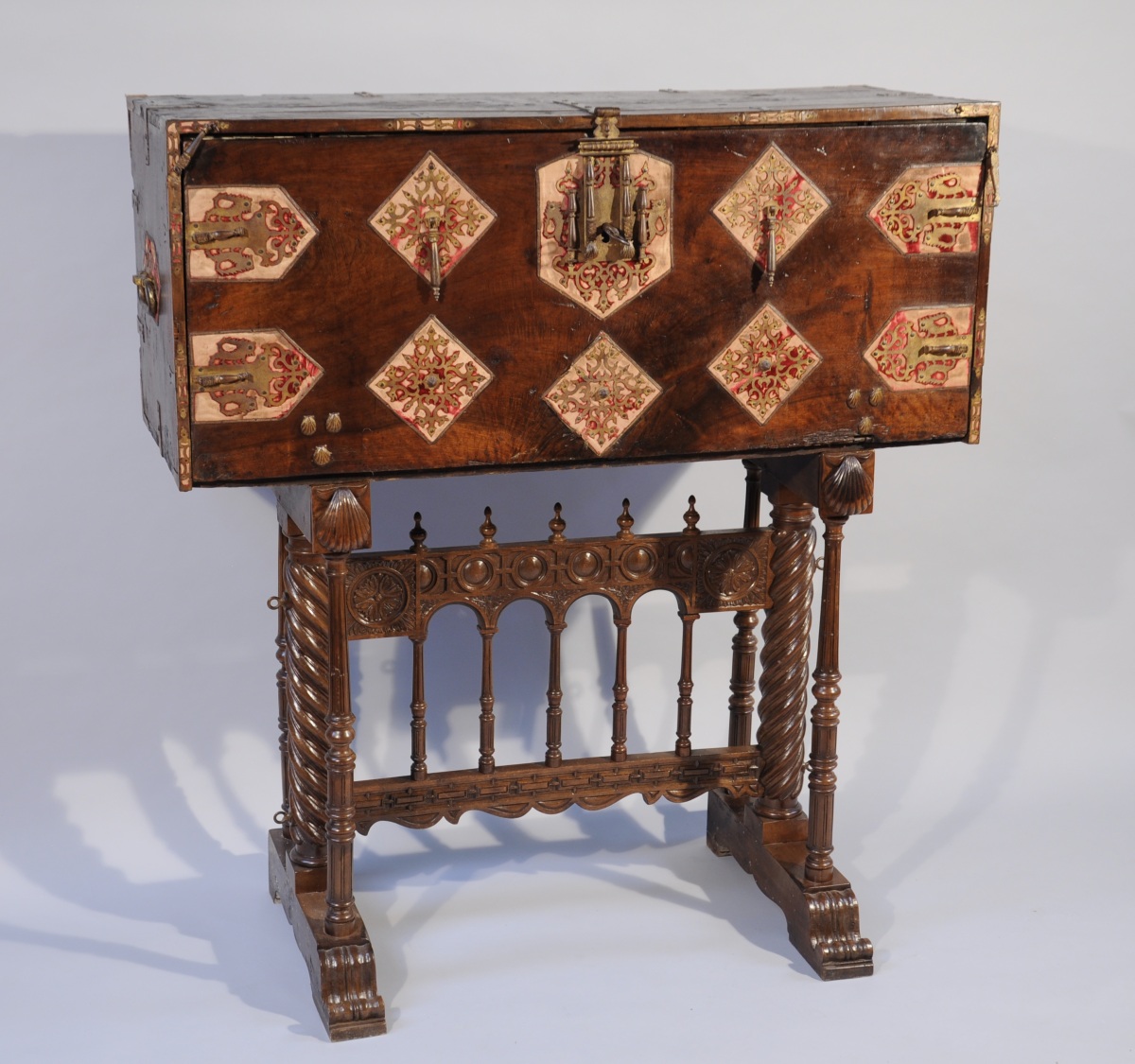 BARGUENO dit aussi "ESCRITORIO DE SALAMANCA" de forme rectangulaire en noyer et os. L'abattant est orné d'une serrure à double moraillon et de neuf ferrures ajourées et dorées à décor de lions et rosaces disposés sur un velours cramoisi, et de six coquilles de Saint-Jacques Compostelle. Poignées latérales. Il ouvre sur treize tiroirs rectangulaires verticaux et horizontaux et un vantail central en noyer sculpté polychrome et doré rehaussé d'incrustations d'os peint. Façades aux portiques architecturés à colonnettes torses, frontons et motifs géométriques. Boutons de tirage en forme de coquille.