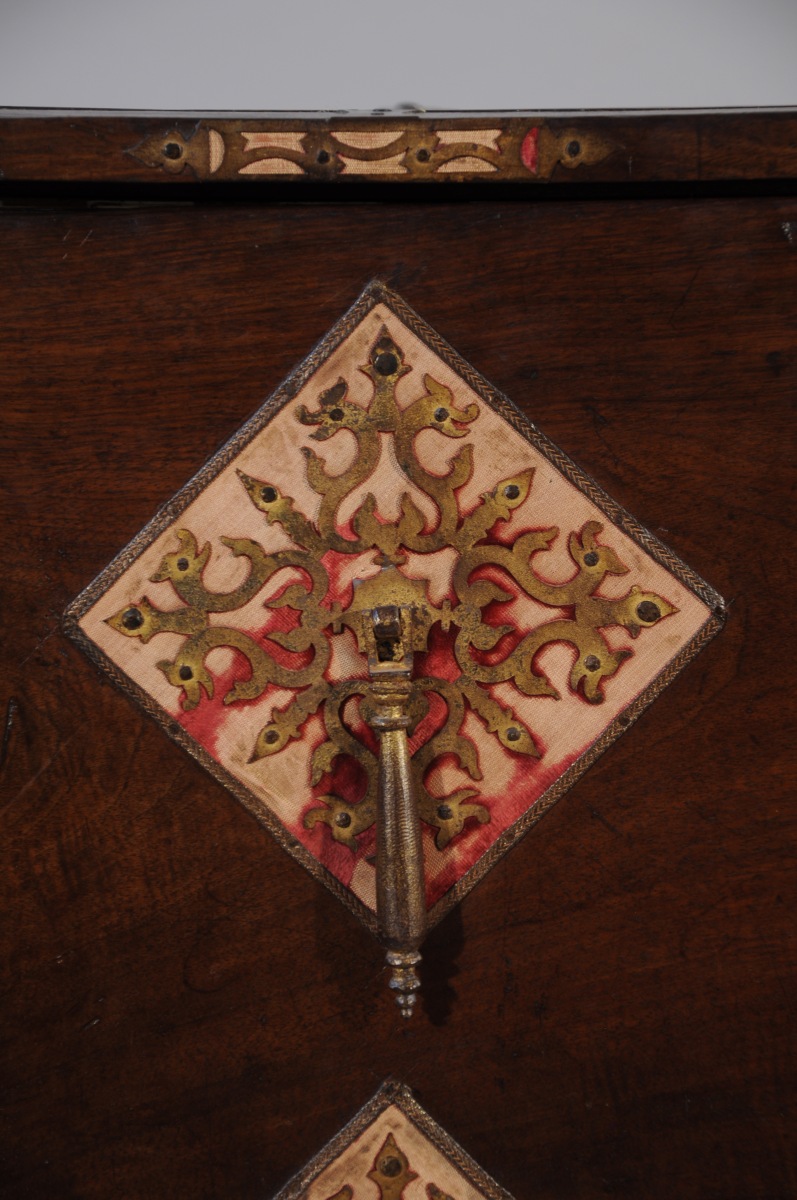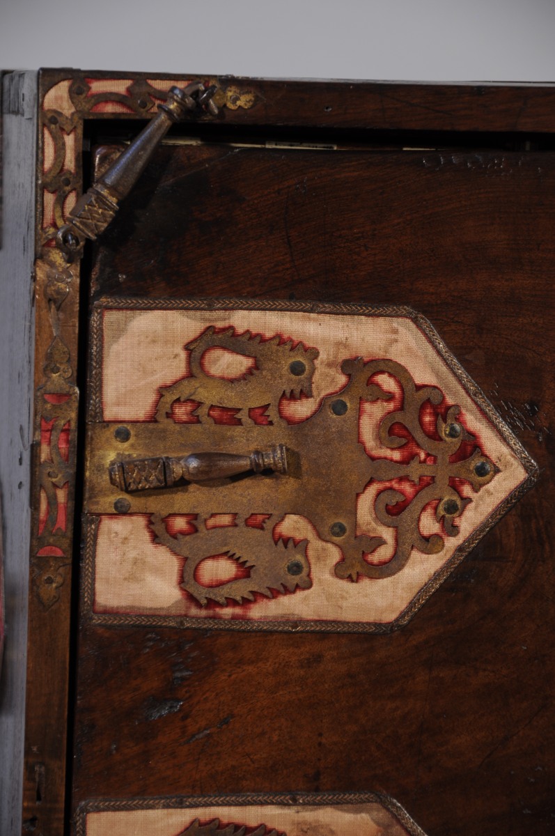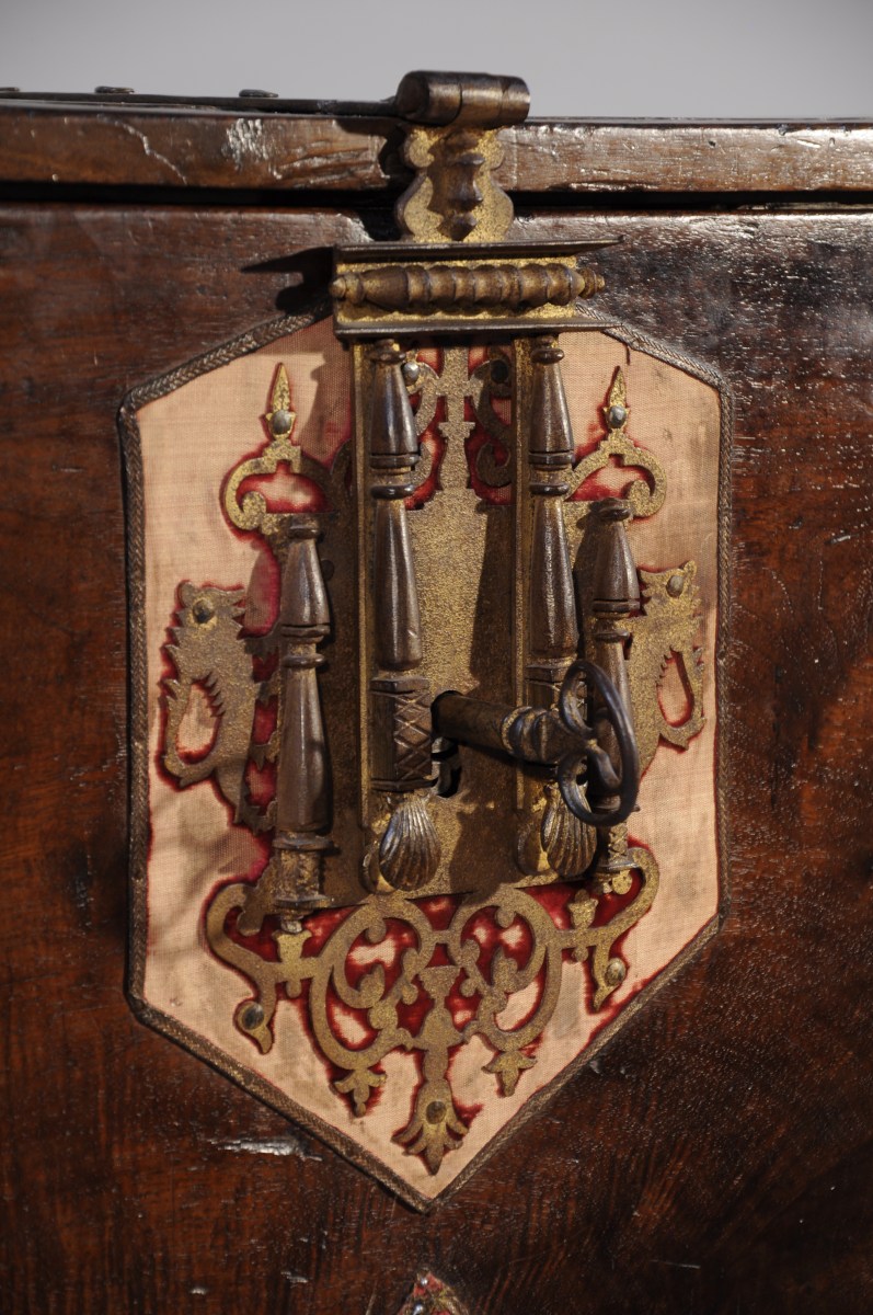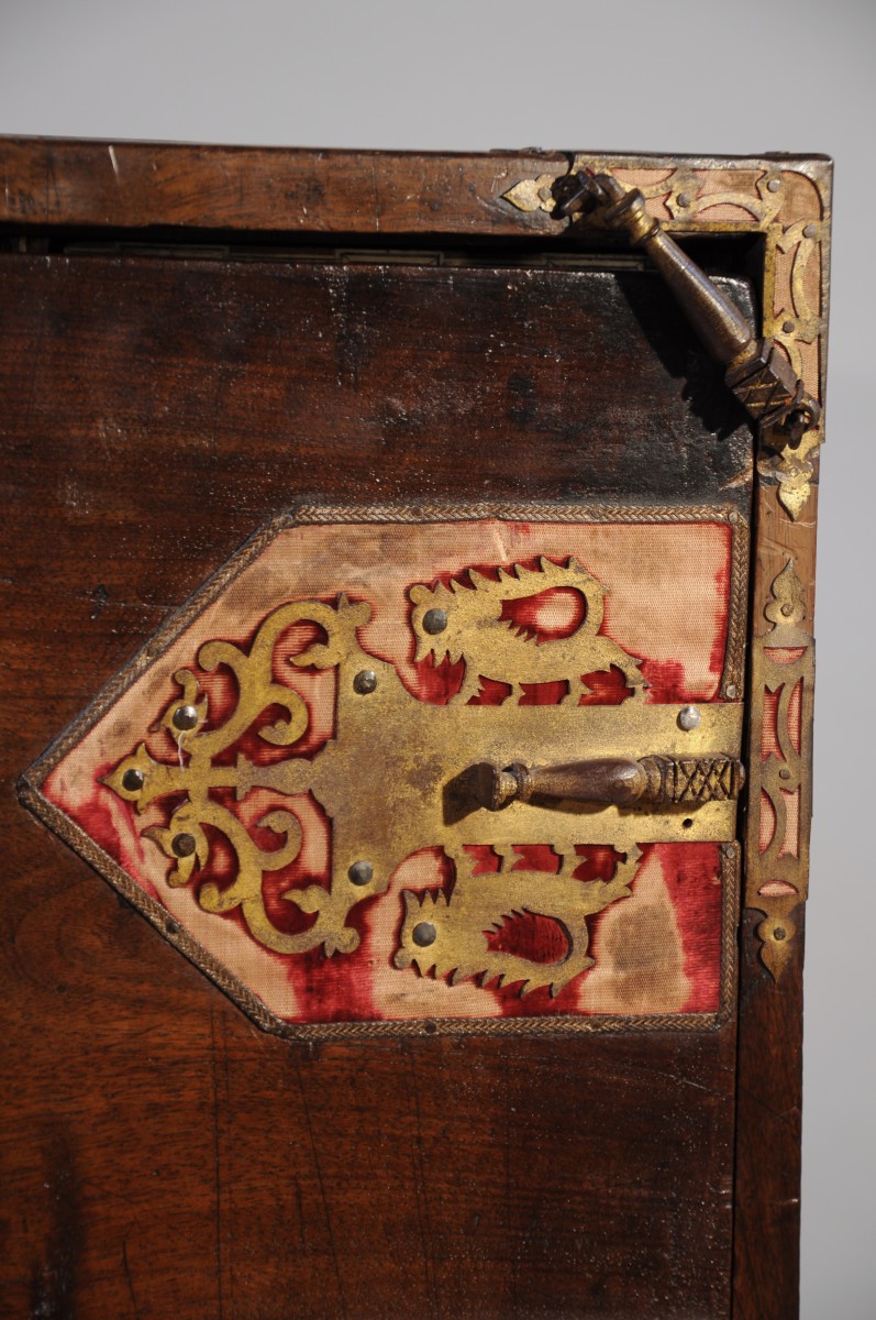 BARGUENO dit aussi "ESCRITORIO DE SALAMANCA" de forme rectangulaire en noyer et os. L'abattant est orné d'une serrure à double moraillon et de neuf ferrures ajourées et dorées à décor de lions et rosaces disposés sur un velours cramoisi, et de six coquilles de Saint-Jacques Compostelle. Poignées latérales. Il ouvre sur treize tiroirs rectangulaires verticaux et horizontaux et un vantail central en noyer sculpté polychrome et doré rehaussé d'incrustations d'os peint. Façades aux portiques architecturés à colonnettes torses, frontons et motifs géométriques. Boutons de tirage en forme de coquille.