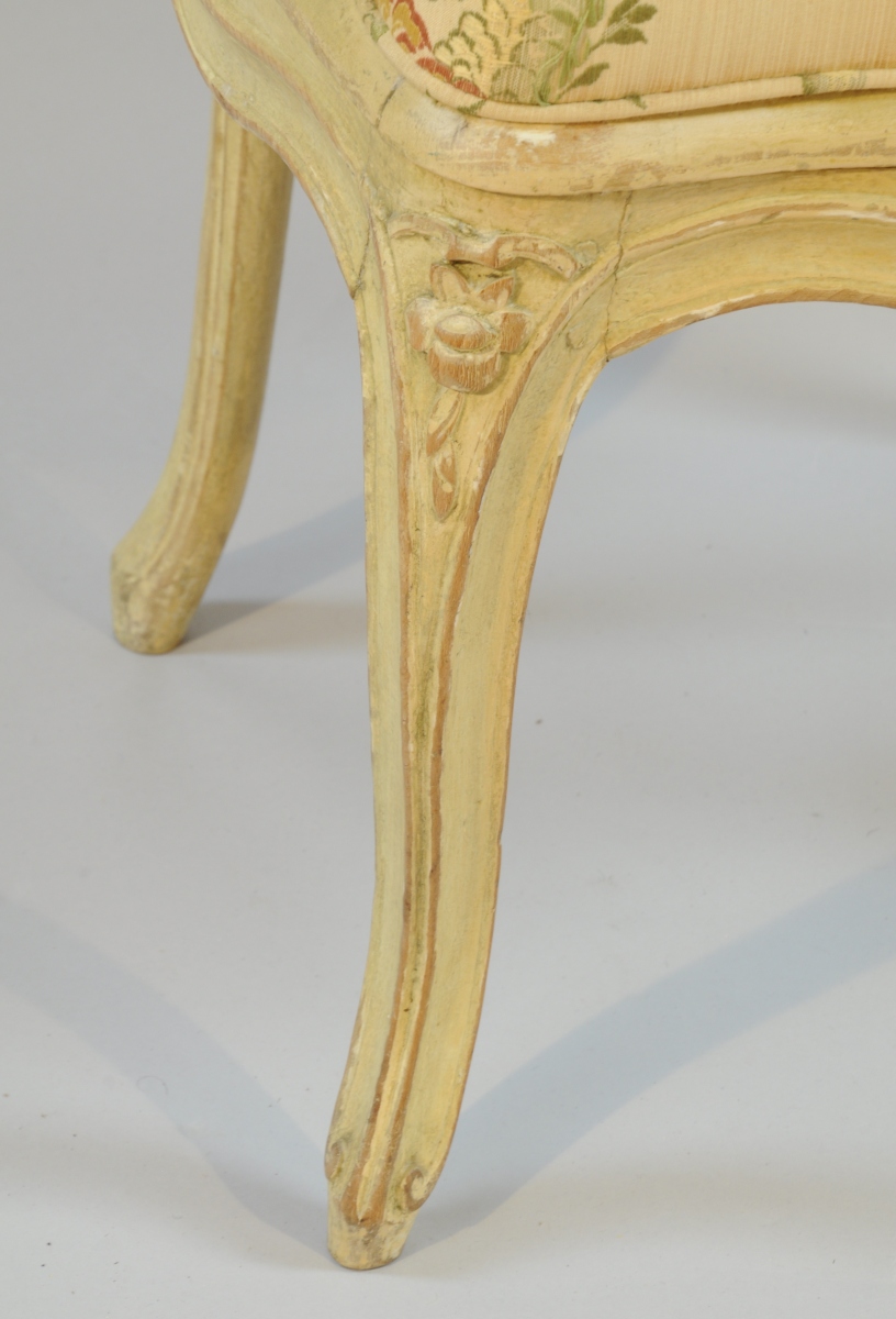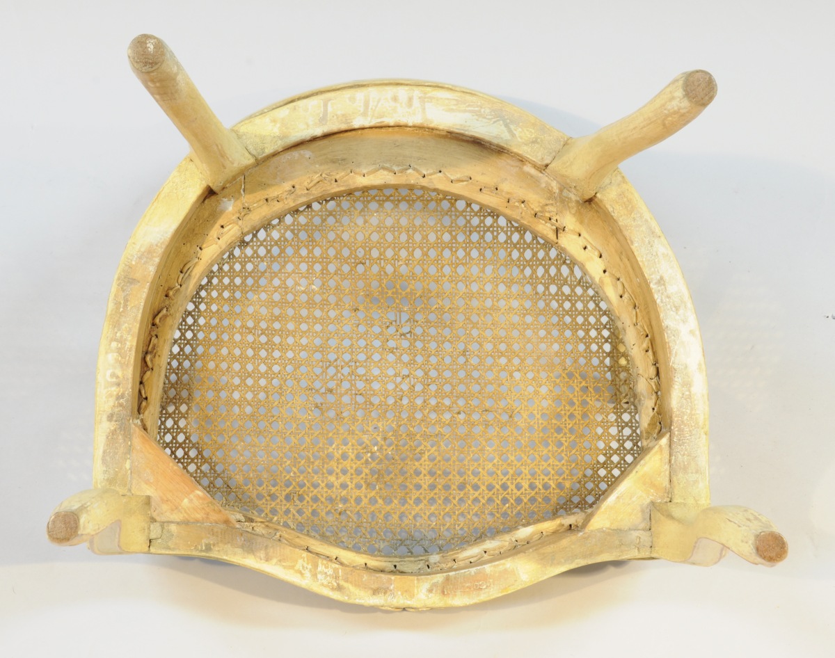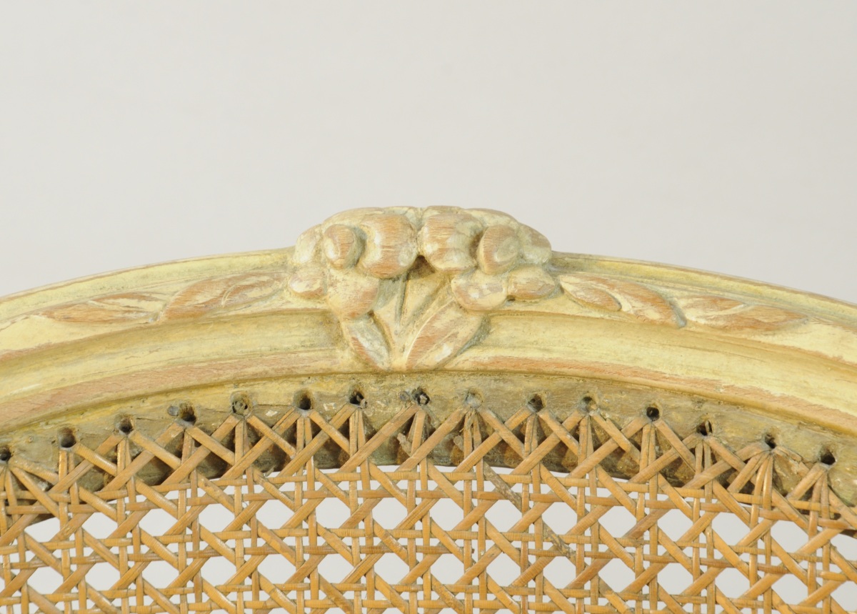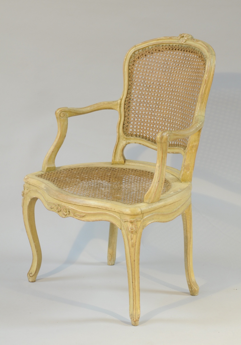 FAUTEUIL CABRIOLET canné en hêtre mouluré, sculpté et relaqué crème. Dossier violonné, consoles d'accotoir en coup de fouet. Traverse haute du dossier et ceinture sculptée de deux fleurettes feuillagées. Il repose sur quatre pieds cambrés, les deux pieds antérieurs sculptés d'une fleurette.