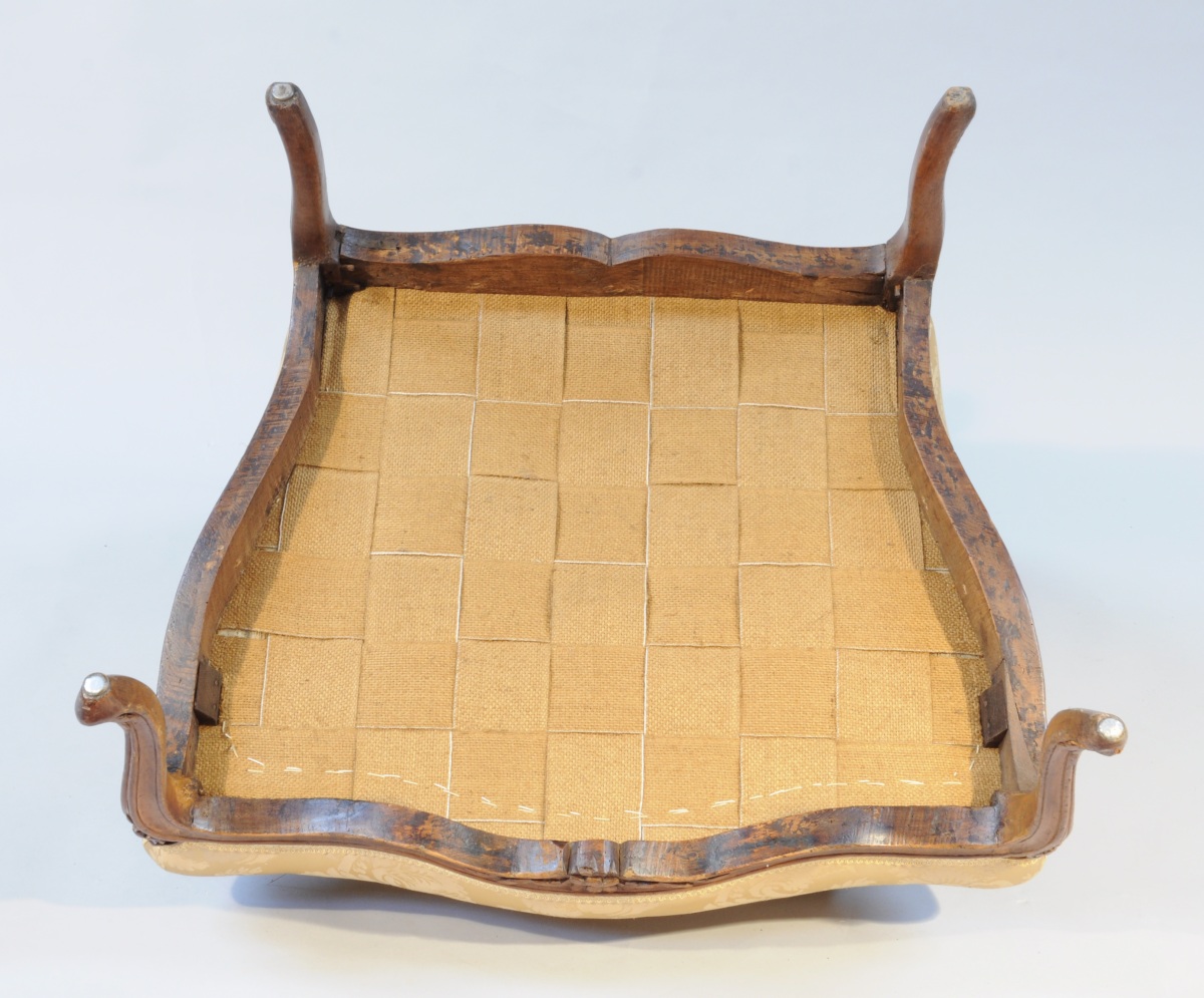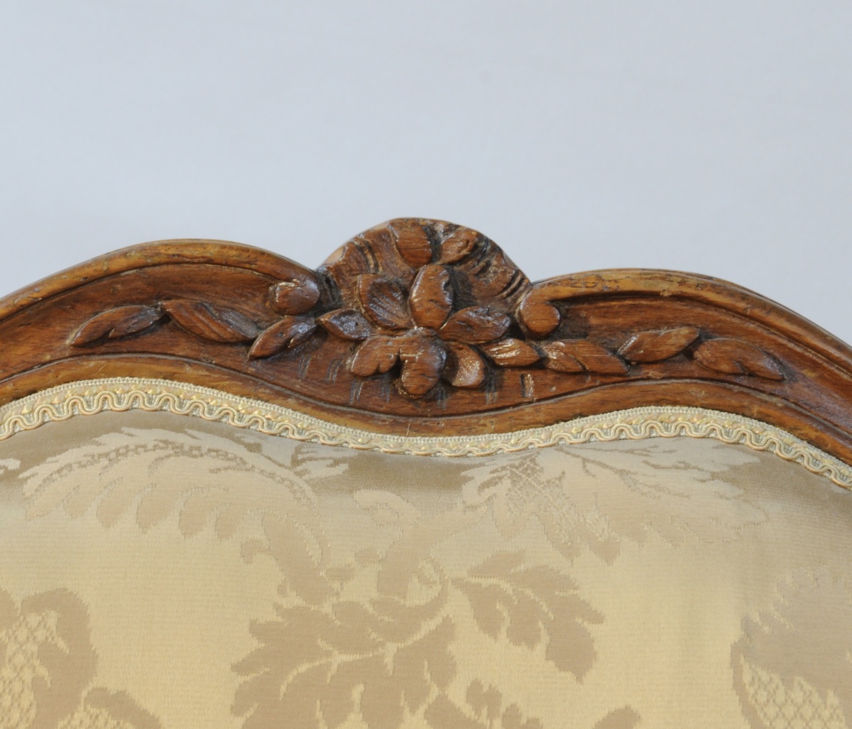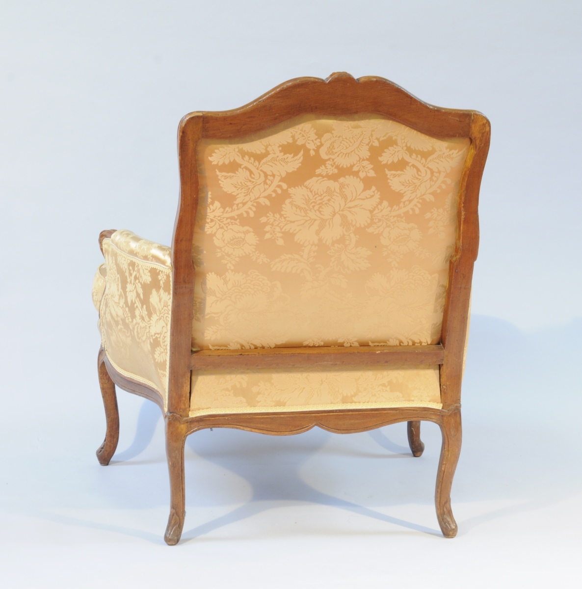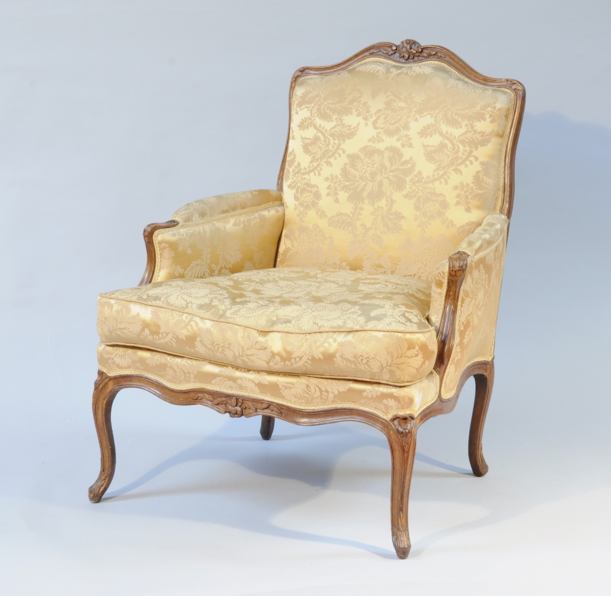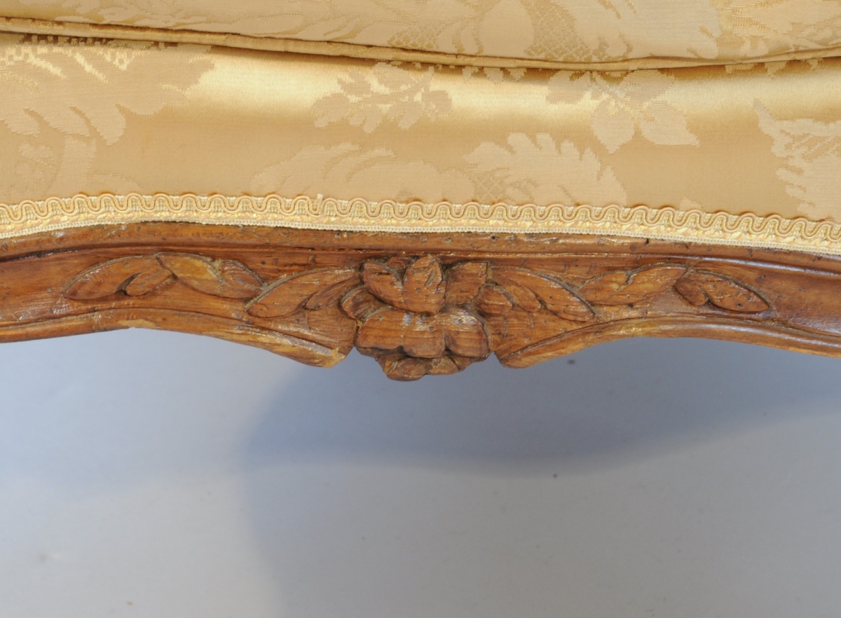 BERGÈRE en hêtre naturel mouluré et sculpté. Dossier chantourné, consoles d'accotoir en coup de fouet. Traverse haute du dossier et ceinture sculptée d'un motif feuillagé. Il repose sur quatre pieds cambrés à feuilles d'acanthe, les deux antérieurs sculptés d'une fleurette en chute.