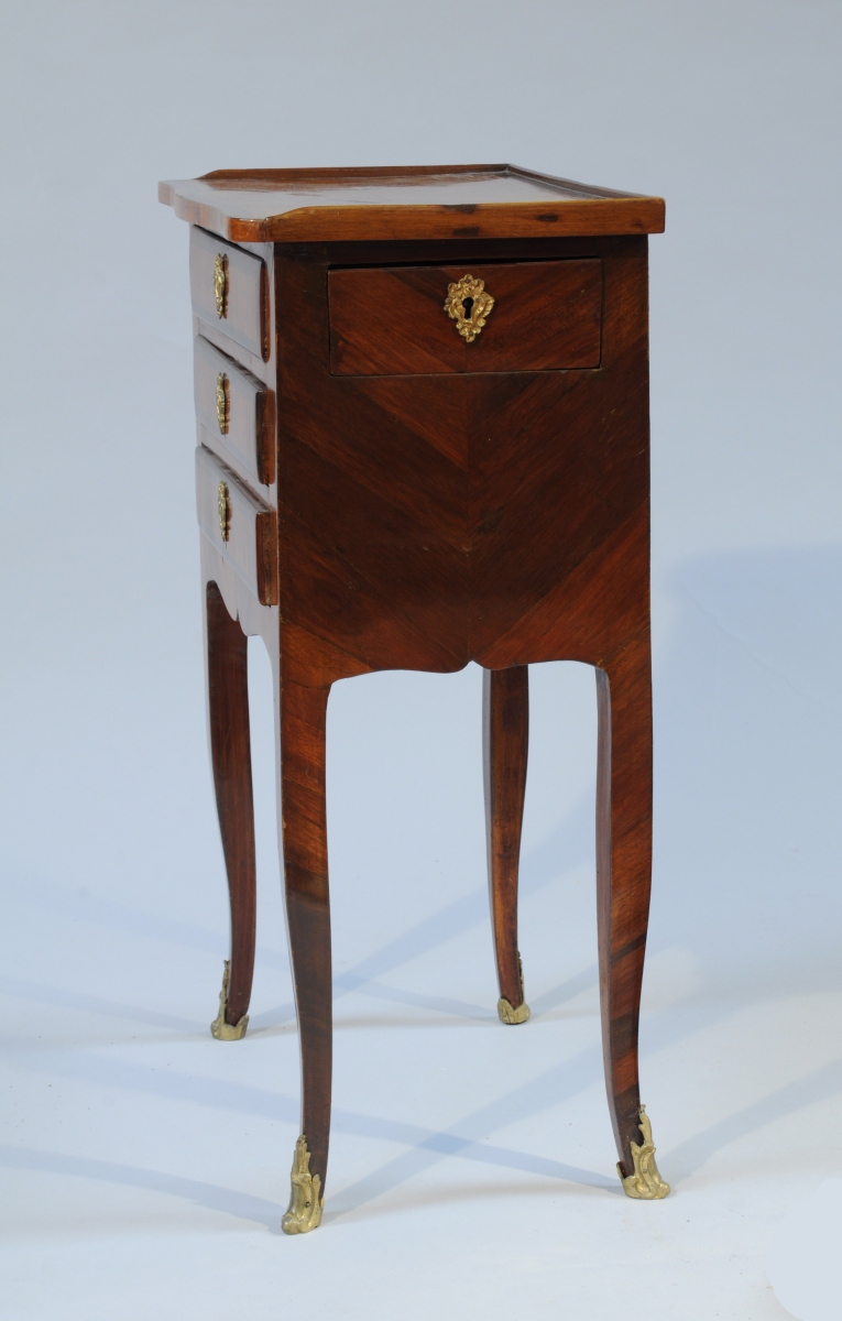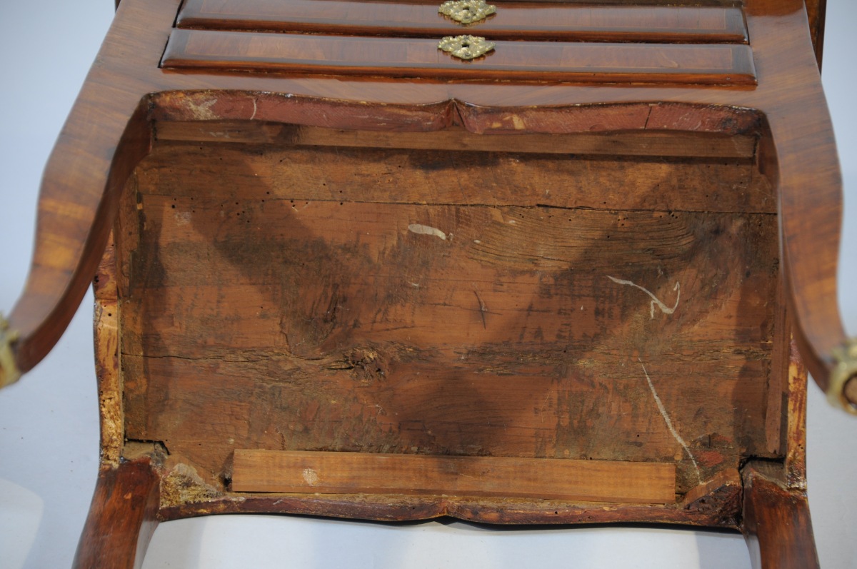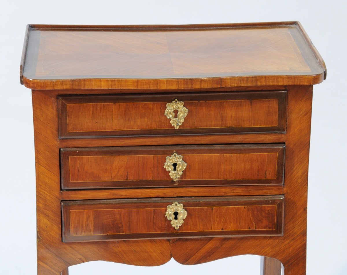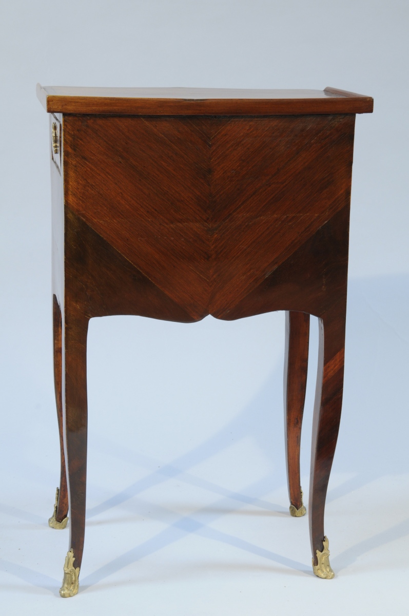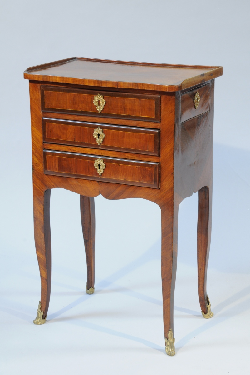 TABLE VOLANTE en bois de placage toutes faces et filets de bois clair ouvrant à deux tiroirs en façade et un sur le côté. Un tiroir simulé. Piètement cambré. Plateau marqueté à rebords.
