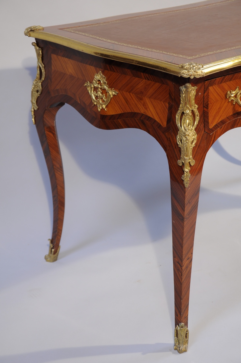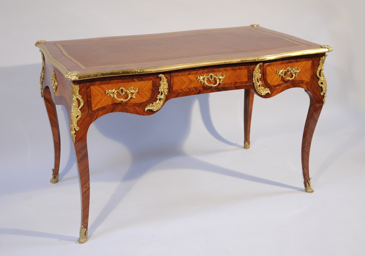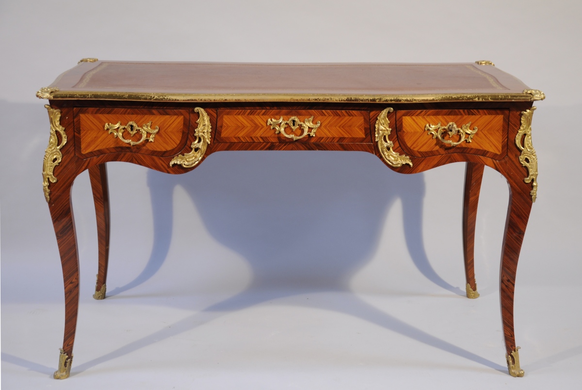 BUREAU PLAT en bois de placage, de satiné et bois de rose. Il repose sur quatre pieds galbés. Il ouvre à trois tiroirs en façade. Riche ornementation en bronzes dorés et ciselés toutes faces.