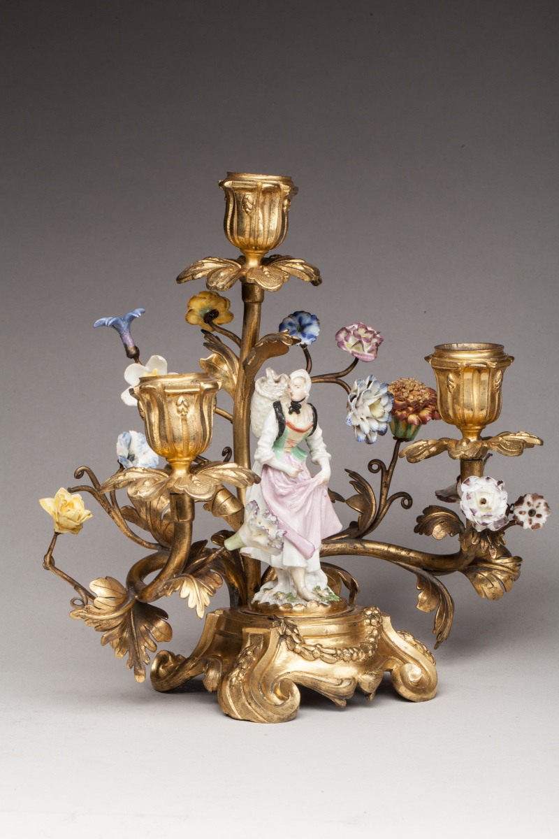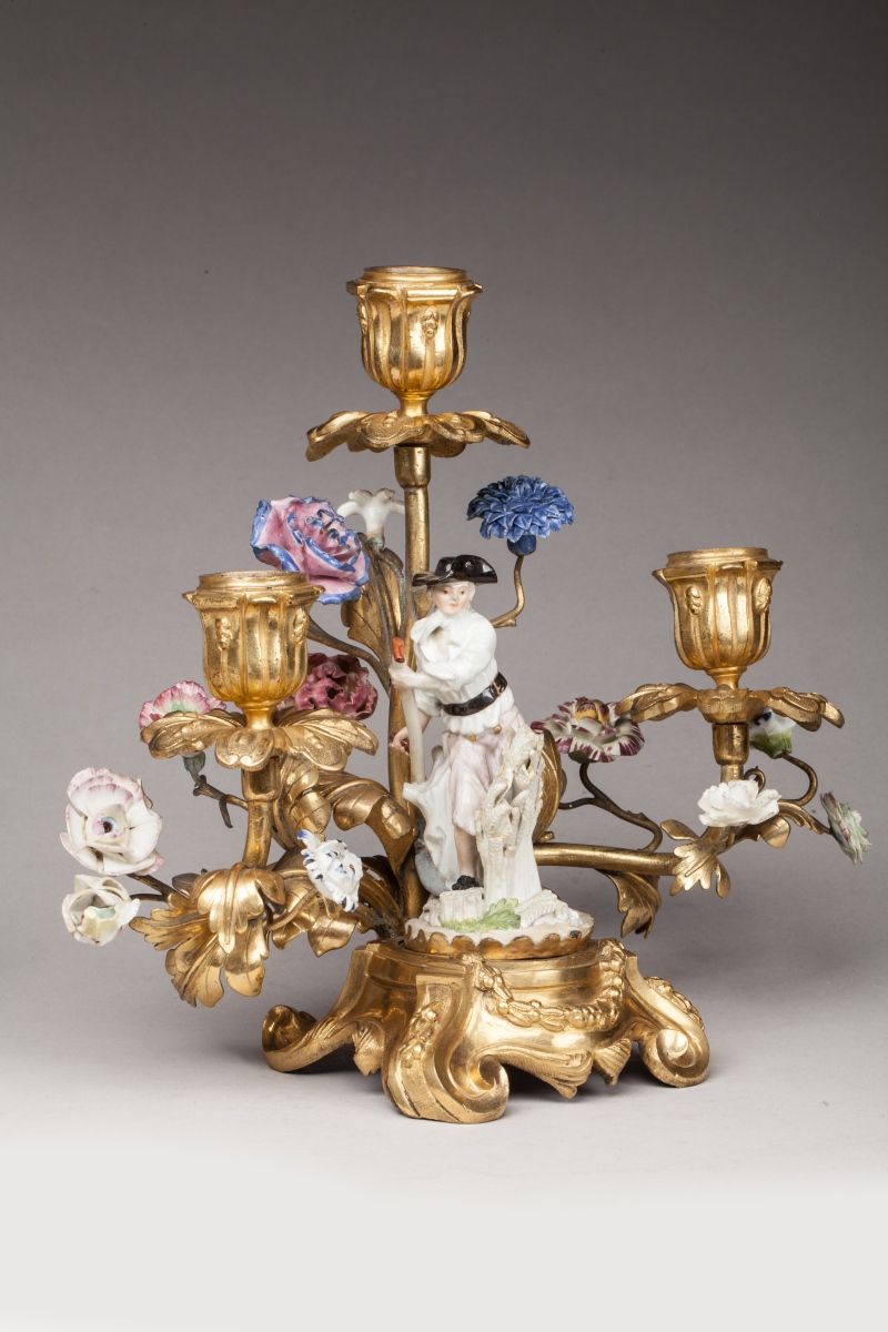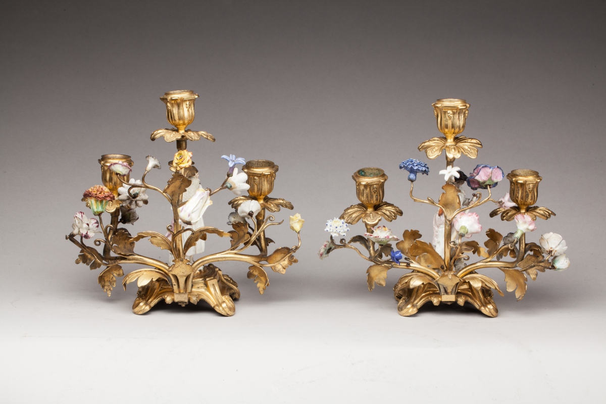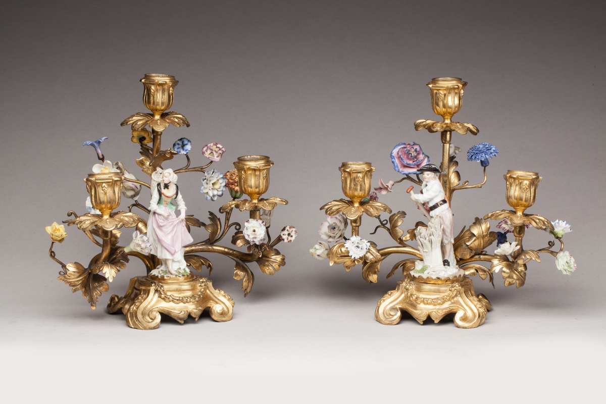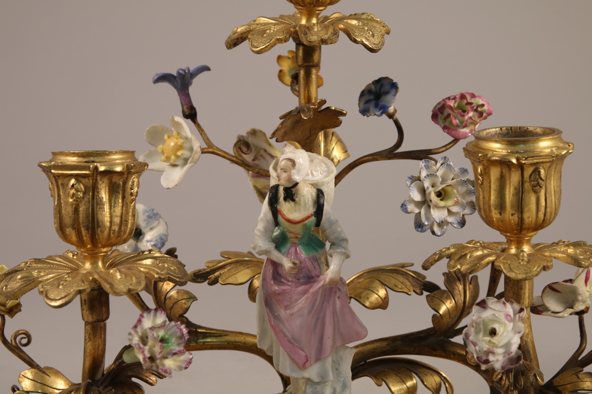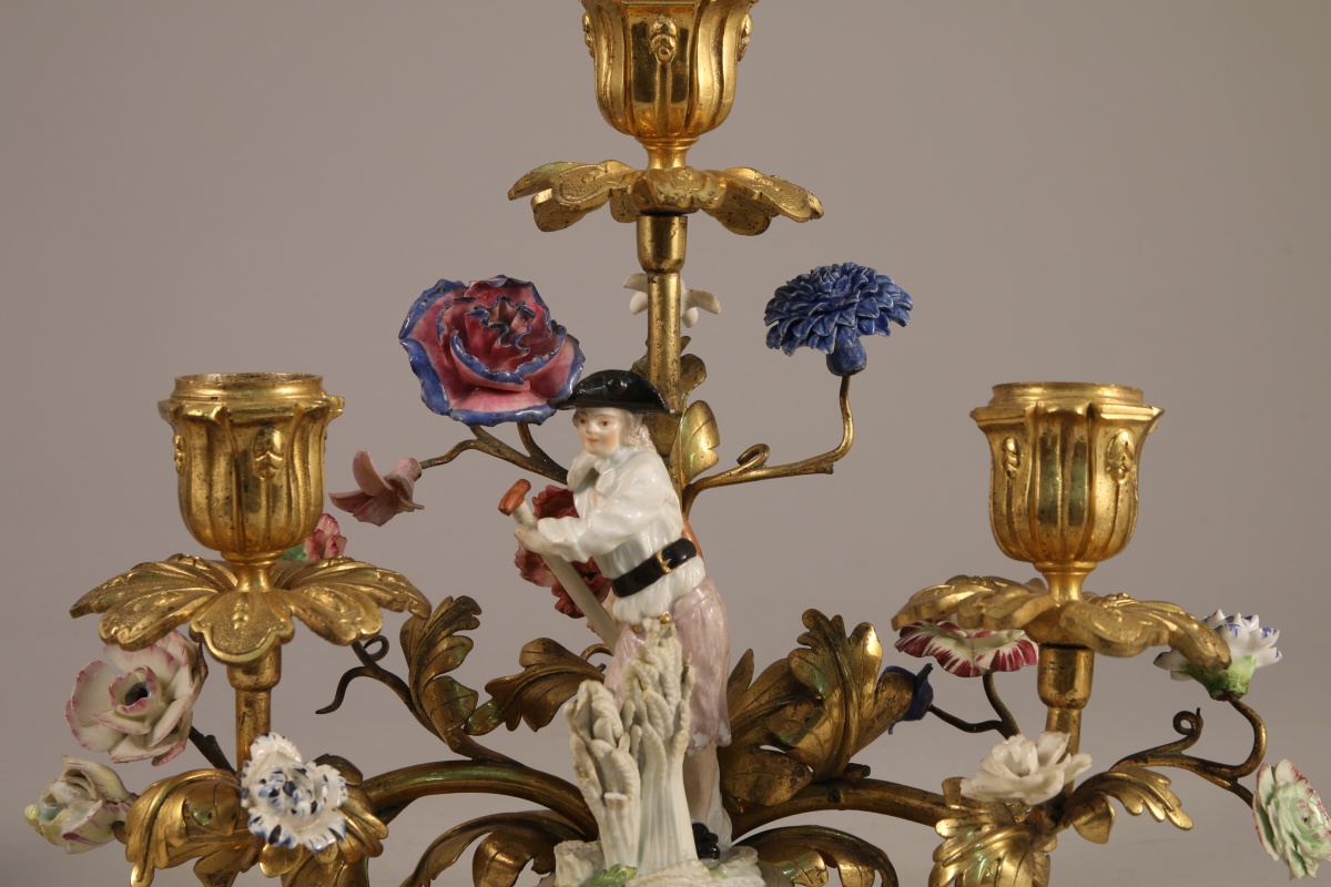 PAIRE de CANDÉLABRES à trois lumières en bronze doré, terrasse à enroulements ornée de guirlandes de fleurs, et branchages de feuillages déchiquetés. Ils sont ornés en porcelaine allemande ancienne de Meissen de fleurs présentant un couple.
