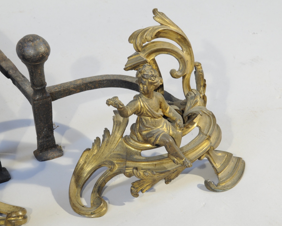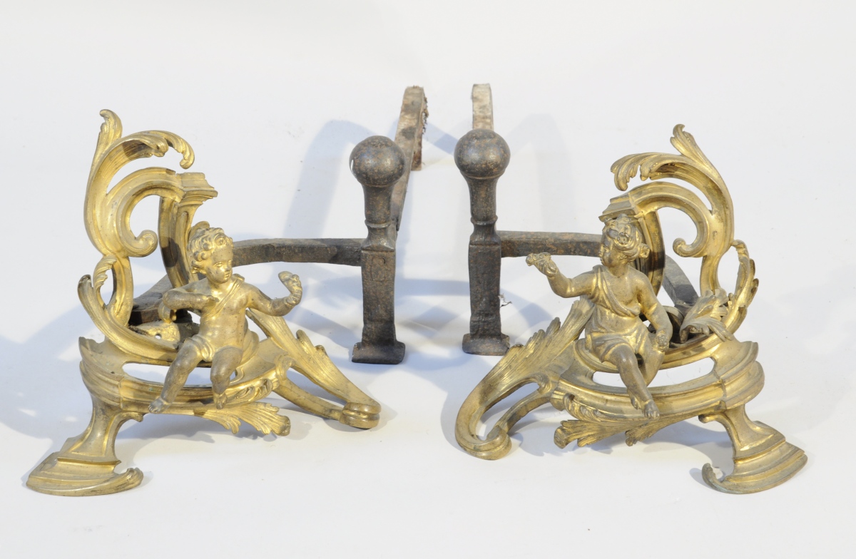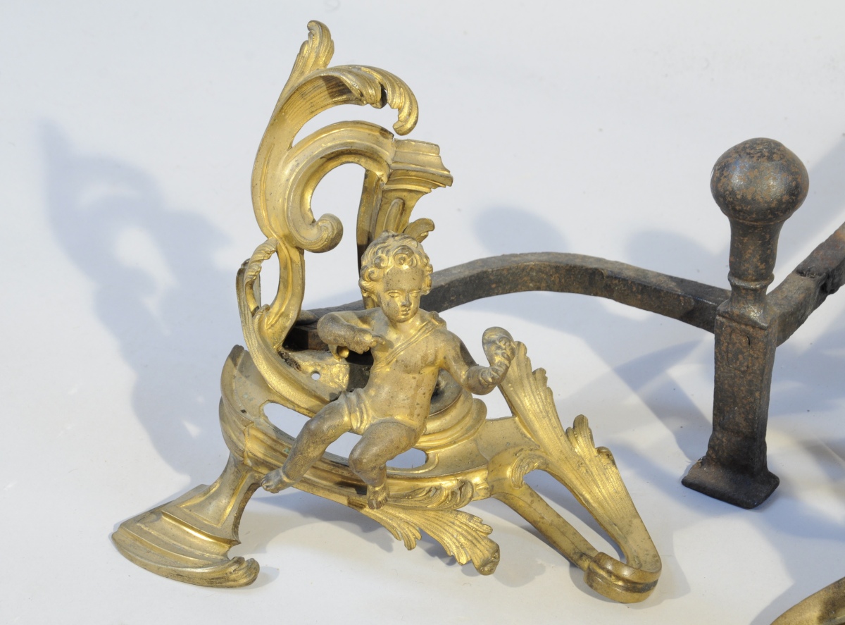 Paire de FEUX asymétriques en bronze ciselé et doré. Ornementation d'enroulements feuillagés. L'un agrémenté d'un putto tenant un masque et l'autre d'une fillette présentant des fleurs.