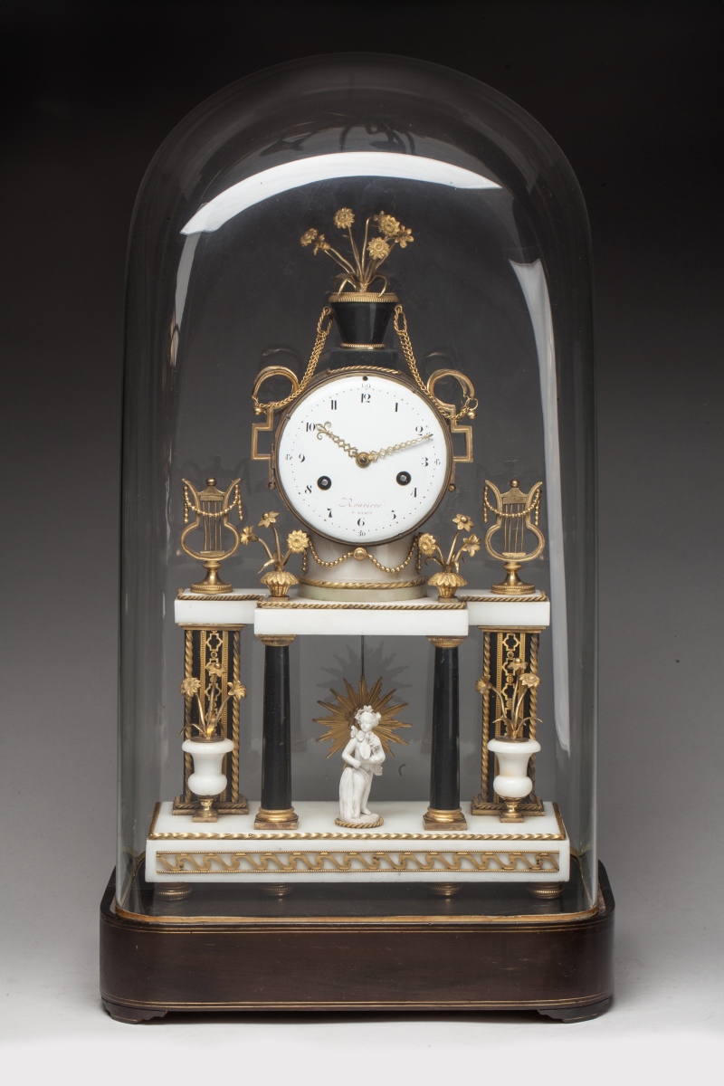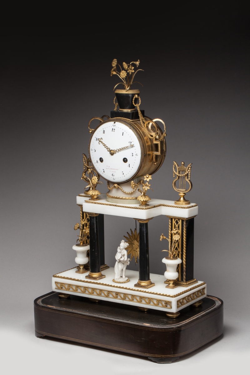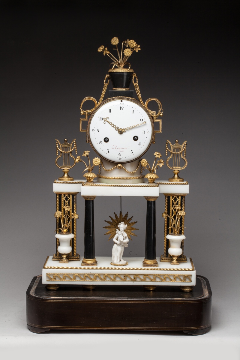 Le portique est formé de deux colonnes antérieures en marbre noir agrémentées d'une base et d'un chapiteau d'ordre dorique en bronze doré, et de deux piliers postérieurs appliqués de frises en bronze doré.
