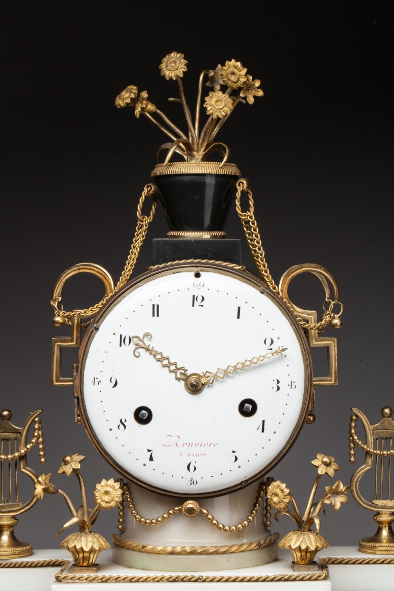 Cadran émaillé marqué des heures et gradué par périodes de cinq minutes en chiffres arabes signé «Rouvière à Paris». Balancier à masque rayonnant.