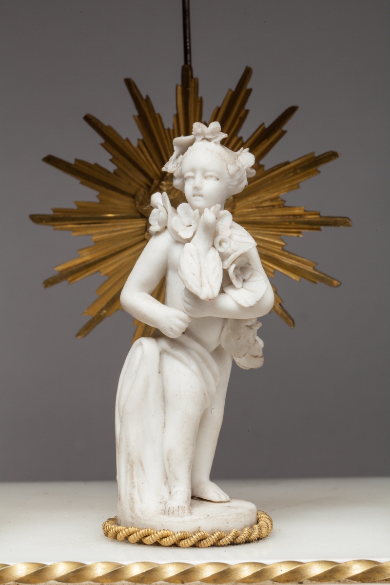 Il repose sur une base cylindrique en marbre blanc ornée d'une torsade et d'une guirlande de perles en bronze doré, placée au centre d'une terrasse soutenue par les colonnes et piliers.