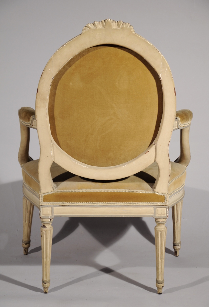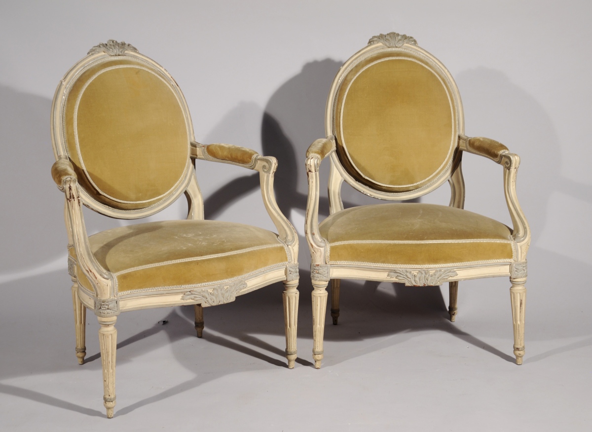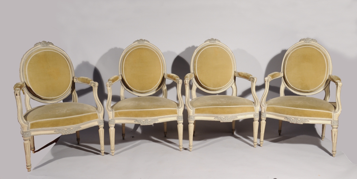 Suite de QUATRE FAUTEUILS CABRIOLETS à dossier médaillon en bois mouluré, sculpté et rechampi crème et gris. Le sommet du dossier et le centre de la ceinture sculptés d'une large feuille d'acanthe. Consoles d'accotoirs en coup-de-fouet. Dés de raccordement fleuronnés et arrondis à l'avant. Ils reposent sur quatre pieds fuselés, cannelés et rudentés.