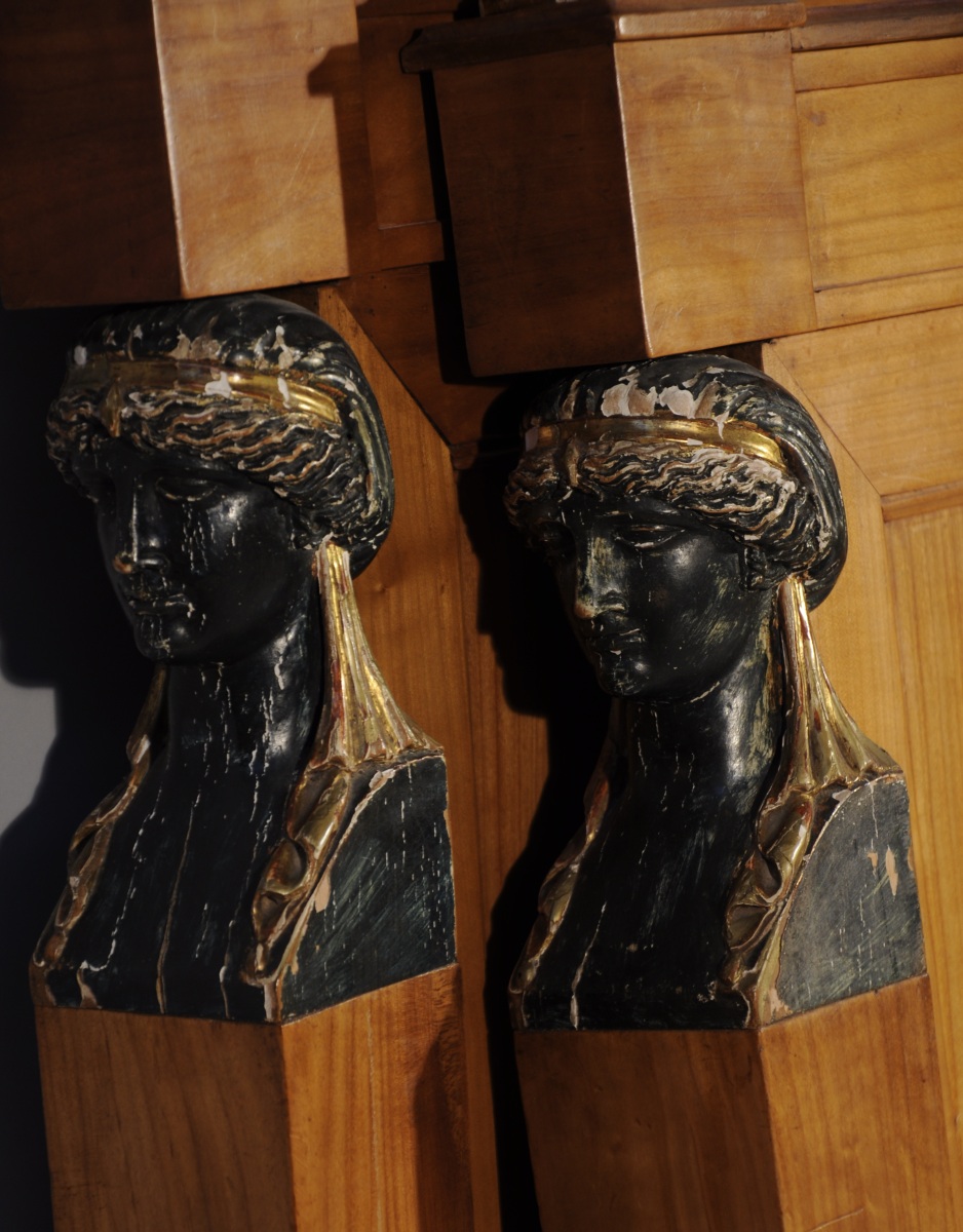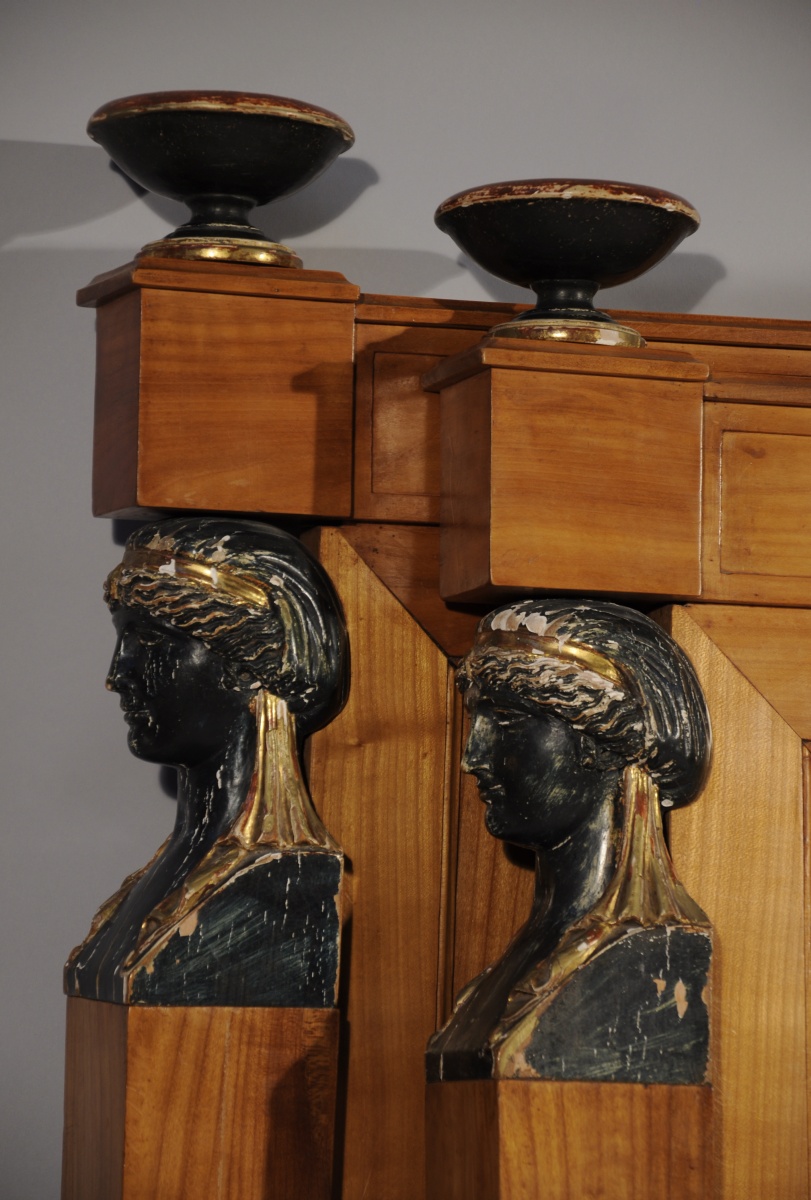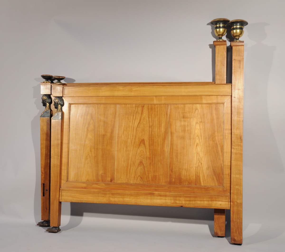 LIT DE TRAVERS dit "à la romaine" à chevets égaux en acajou blond (?). Les montants antérieurs ornés de têtes et pieds d'Égyptiennes en gaine et sommés d'une coupe sur piédouche en bois sculpté, patiné vert et doré. Les montants postérieurs sont agrémentés à l'amortissement d'un vase médicis en bois tourné, repatiné vert et redoré.