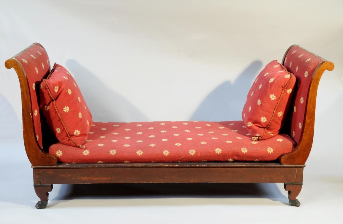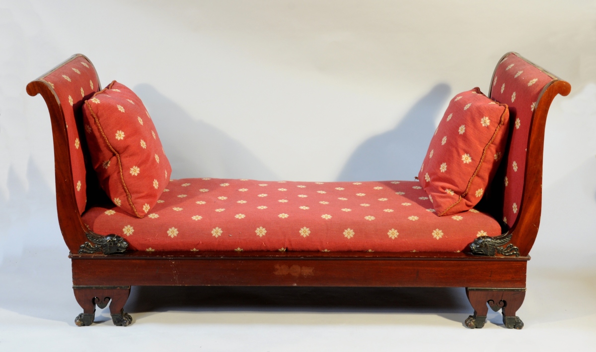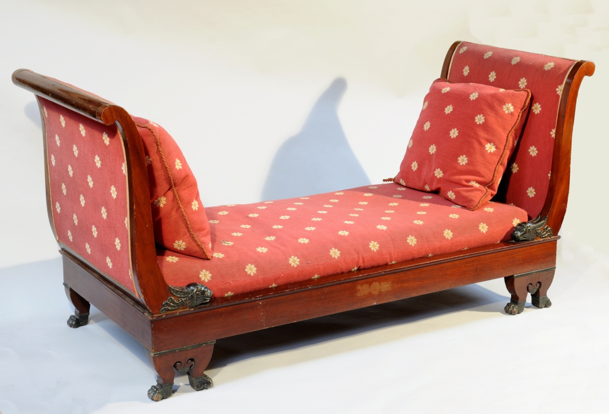 LIT DE REPOS à deux chevets, à flasques en acajou et placage d'acajou. Les montants antérieurs des dossiers terminés par une tête de lion feuillagée patinée à l'imitation du bronze. Il repose sur six pieds griffes patinés de même. Les pieds antérieurs centrés d'enroulements flanquant un motif lancéolé.