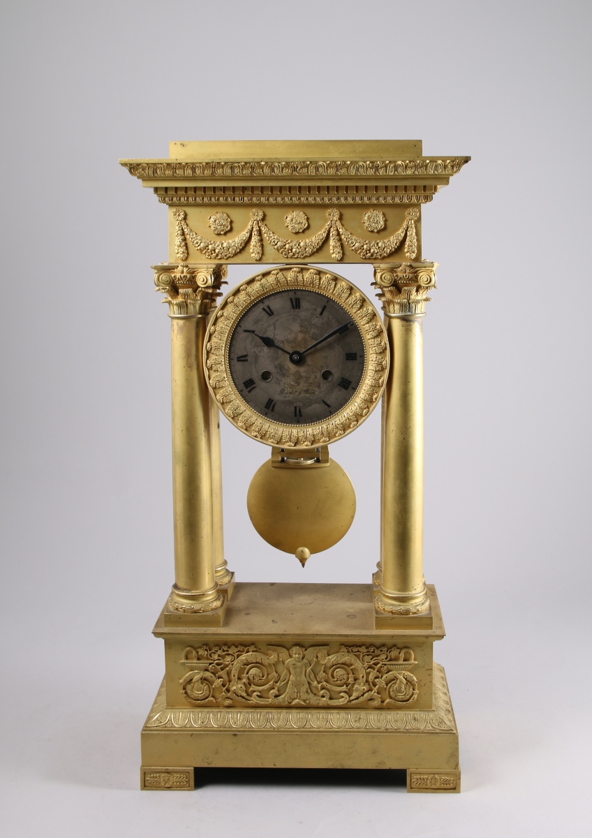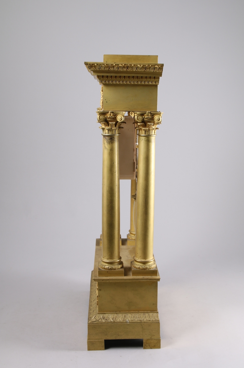 PENDULE PORTIQUE en bronze doré reposant sur une base rectangulaire à quatre petits pieds, frise de lotus et bas relief avec un putti dans des enroulements, supportant quatre colonnes à chapiteaux corinthiens ; les deux colonnes antérieures tiennent un cadran circulaire en acier à chiffres romains ; le fronton en forme de temple antique avec des guirlandes et frises fleuries.
