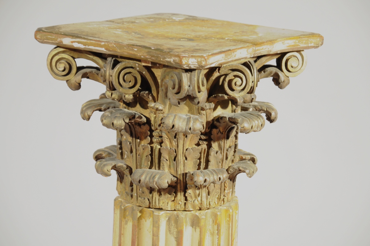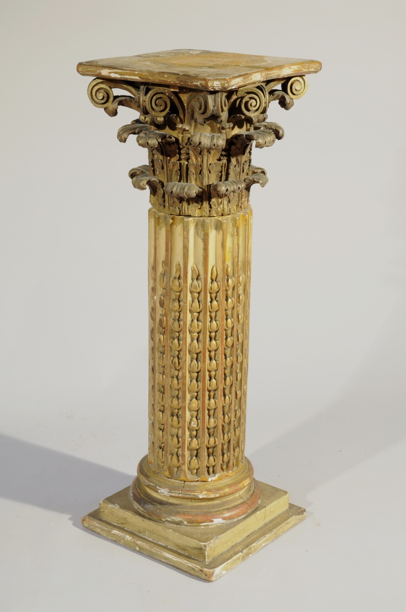 SELLETTE adoptant la forme d'une COLONNE CORINTHIENNE en bois sculpté, stuqué et doré ou bronzé. Le fût cannelé à asperges. Base de forme carrée.