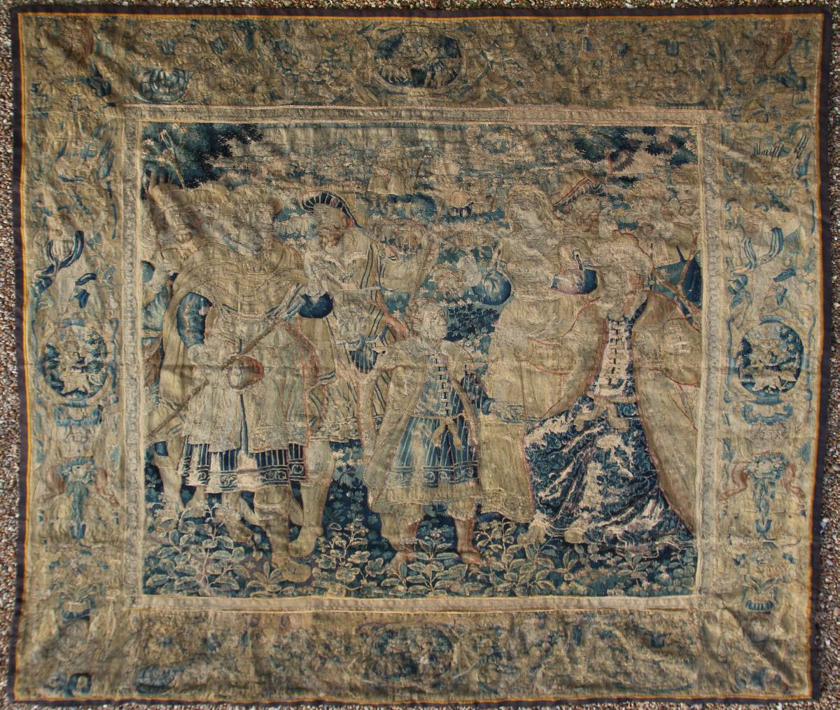 AUBUSSON. TAPISSERIE en laine figurant sur une scène de l'histoire de David, peut-être de la tenture de l'Histoire des rois Saül et David. Bordure richement ornée de cartouches historiés, satyres, personnages canéphores, fruits et feuillages, animaux, dont escargots et chouettes.