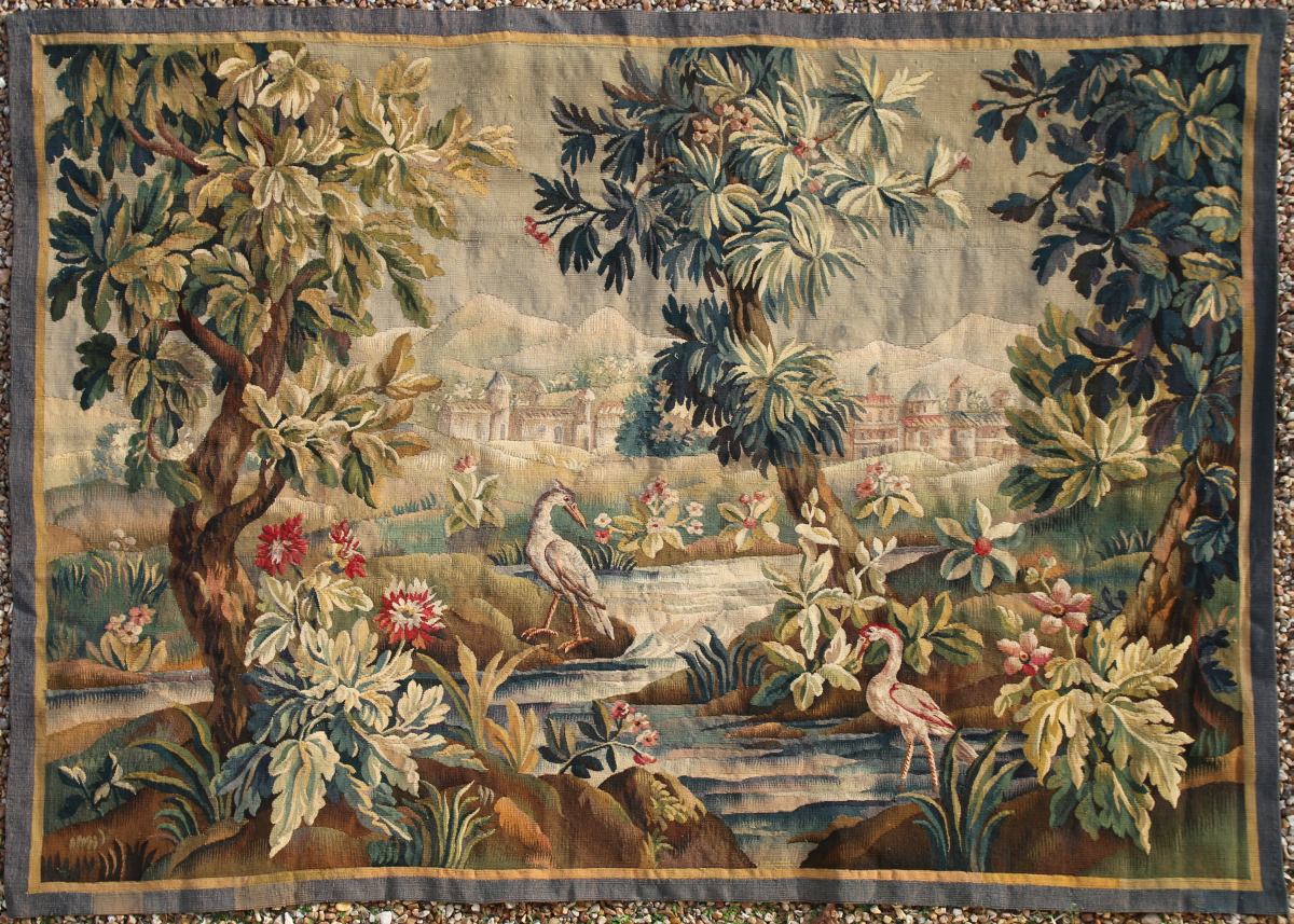 AUBUSSON. TAPISSERIE, verdure en laine. Échassiers au château. Début XIXe. 213 x 160 cm. Couleurs d'une belle fraîcheur.