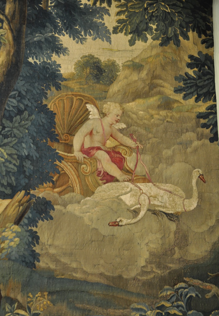 Voici ce qu'en disait Chantal Humbert, dans la cinquième Gazette de l'hôtel Drouot de l'année 1994 : Tapisserie du XVIIIe siècle attribuée à la manufacture de Beauvais, mais plus vraisemblablement à celle des Gobelins, représentant "Vénus accompagnée de Cupidon rencontrant Adonis" (Vendôme, 6 février. Étude Rouillac).