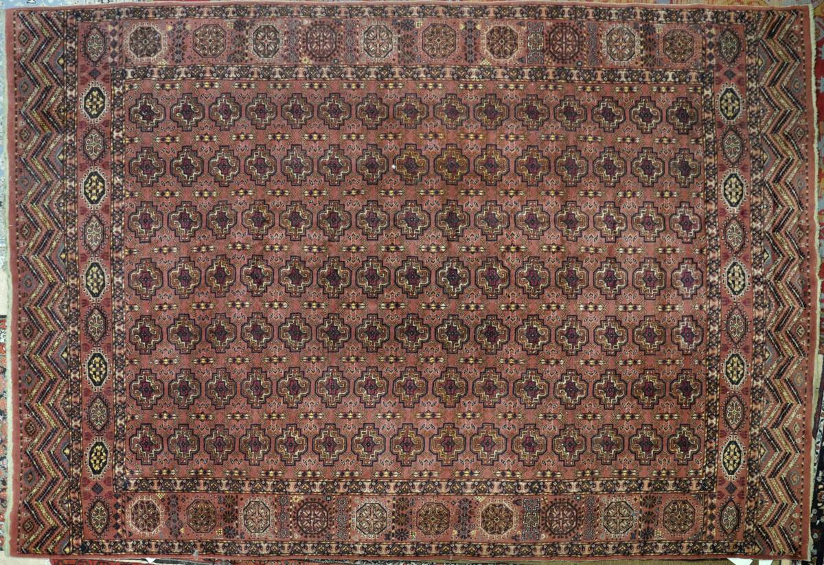 BOUKHARA. TAPIS en laine à fond rouge. Décor de guls, de croix stylisées et de motifs géométriques.