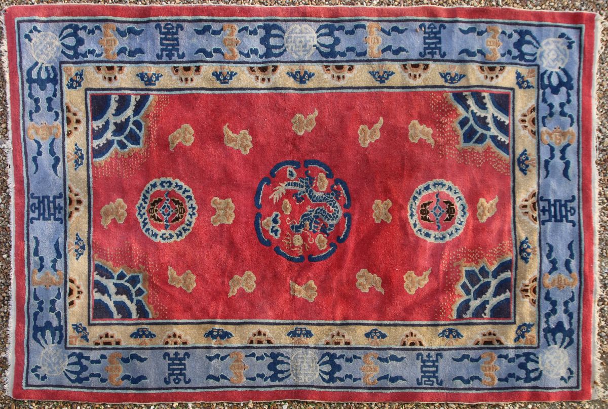 CHINE. TAPIS en laine à décor sur fond rouge, dans un semi de nuées, d'un dragon pourchassant le perle sacrée, de deux médaillons orné de chauves-souris et de fleurs de lotus en écoinçons. Bordure à fond bleu figurant chauves-souris et idéogrammes. Deux contre-bordures, l'une à fond crème ornée de masque de taotie, l'autre rouge.
