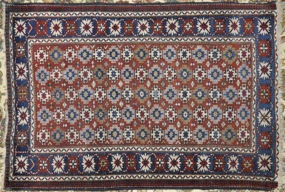 KAZAKHSTAN. TAPIS en laine à fond rouge et bordure bleue. Décor de losanges à crochets et motifs géométriques.