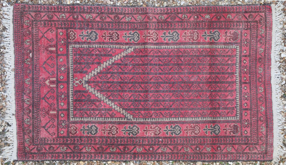 ORIENT. TAPIS DE PRIÈRE en laine à points noués à décor d'un mirhab, sur fond rouge, à bordures multiples.