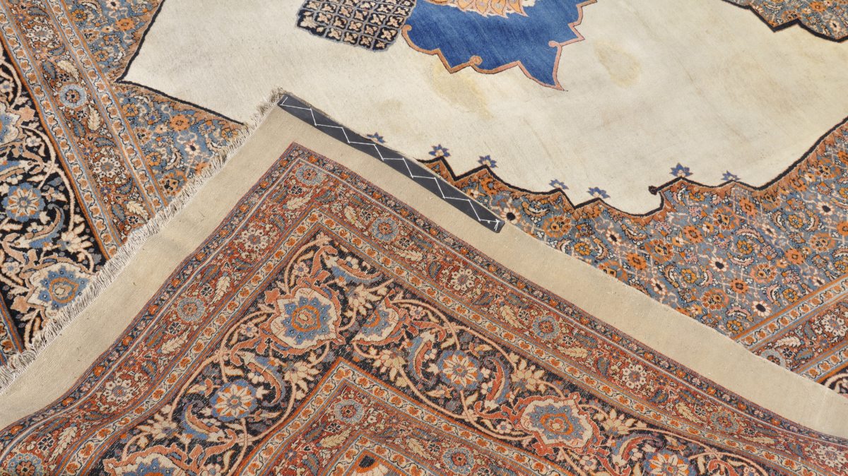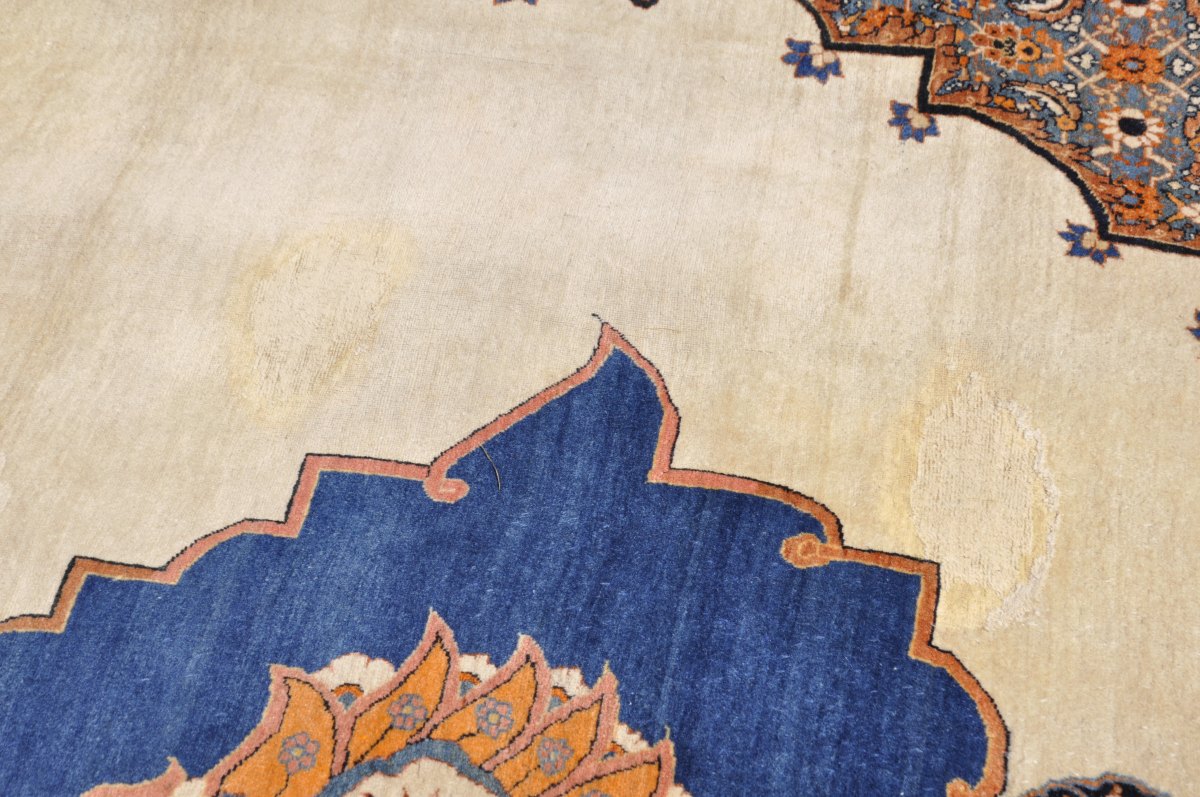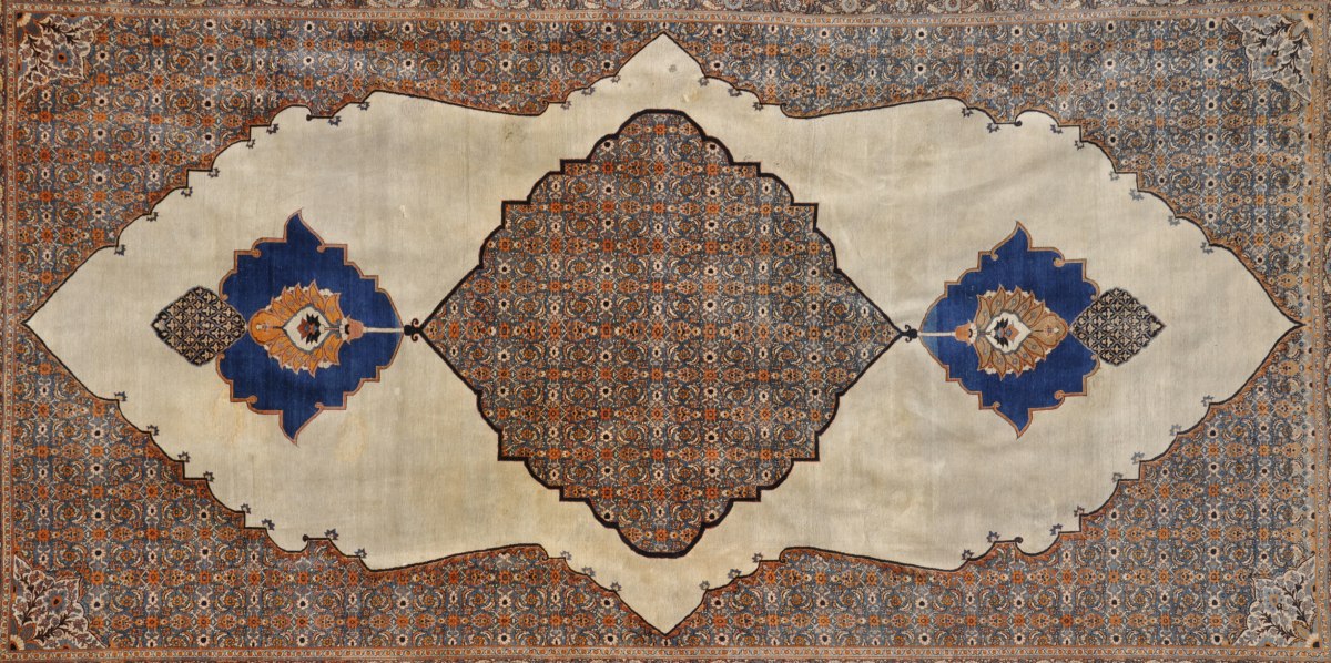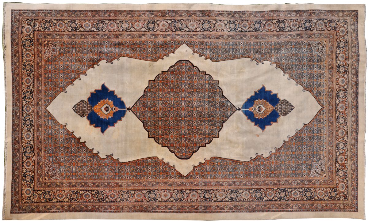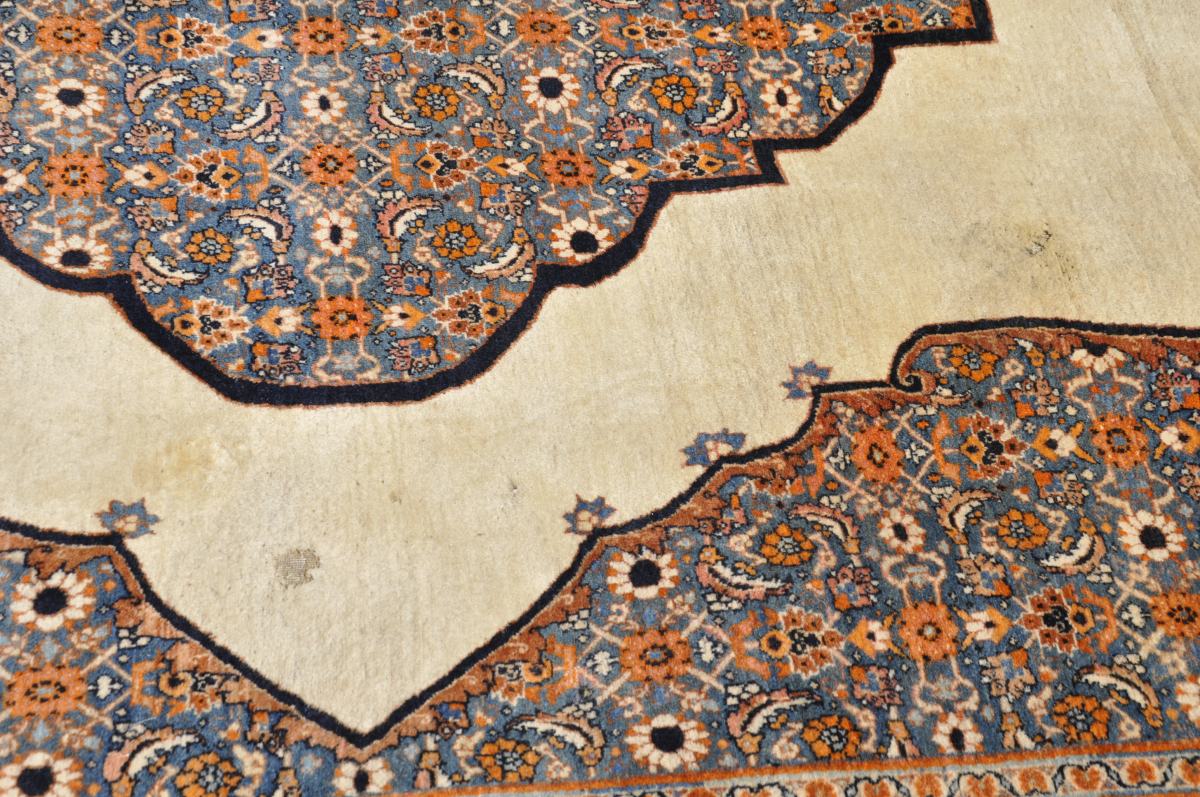 PERSE. TAPIS BIDJAR en laine à motif floral hérati centré d'un médaillon inscrit dans une réserve crème. Bordure florale à fond bleu.