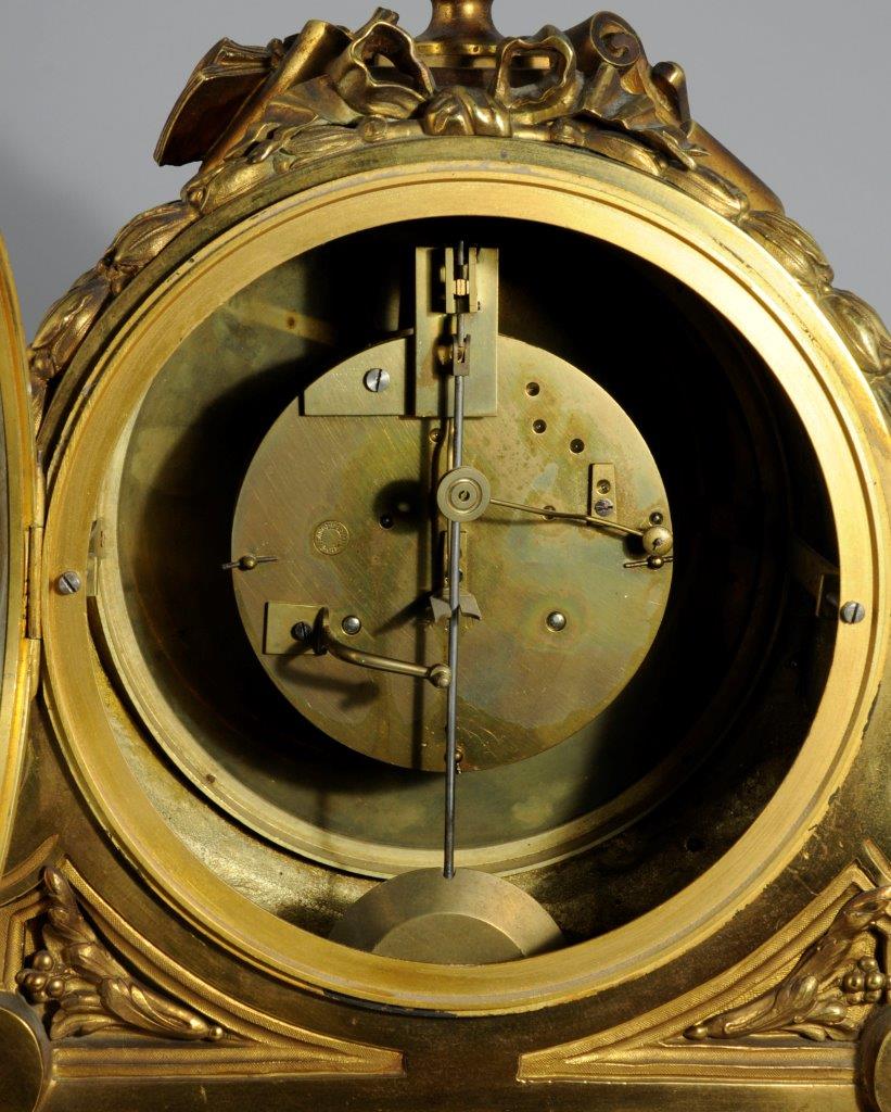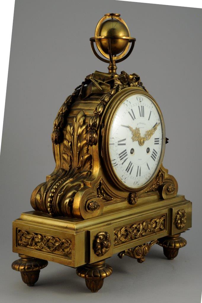 PENDULE À LA GÉOGRAPHIE en bronze ciselé et doré. Riche ornementation de guirlandes feuillagées rubanées, feuilles d'acanthe stylisées et fleurons. Elle est sommée d'un globe terrestre flanqué au pied d'attributs cartographiques. Socle quadrangulaire adhérent reposant sur quatre pieds toupie agrémenté de godrons et feuilles d'eau. Le cadran émaillé blanc indique les heures en chiffres romains et les minutes en chiffres arabes. Il est signé " Mson Marquis / Languereau / Paris ". Le mouvement marqué " Languereau / Paris ". Deux aiguilles en bronze finement ciselées à décor ajouré de rinceaux feuillagés agrémentés, pour la plus grande, d'un dauphin.