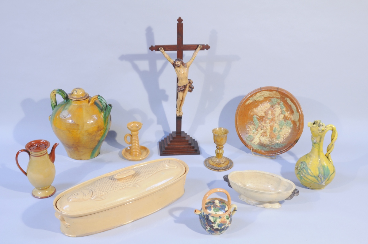 Ensemble de TERRES-CUITES VERNISSÉES JAUNES comprenant 10 pièces, dont : un grand Christ en Croix (haut. totale 39 cm), un pichet à panse basse et anse torsadée (haut. 34 cm), un calice (haut. 20 cm), une importante chevrette (haut. 38 cm), une poissonnière (long. 66 cm), un grand plat creux avec une scène animée du nouveau monde daté 1678 (diam. 38,5 cm), un bougeoir, une cafetière, une théière, une coupe navette.