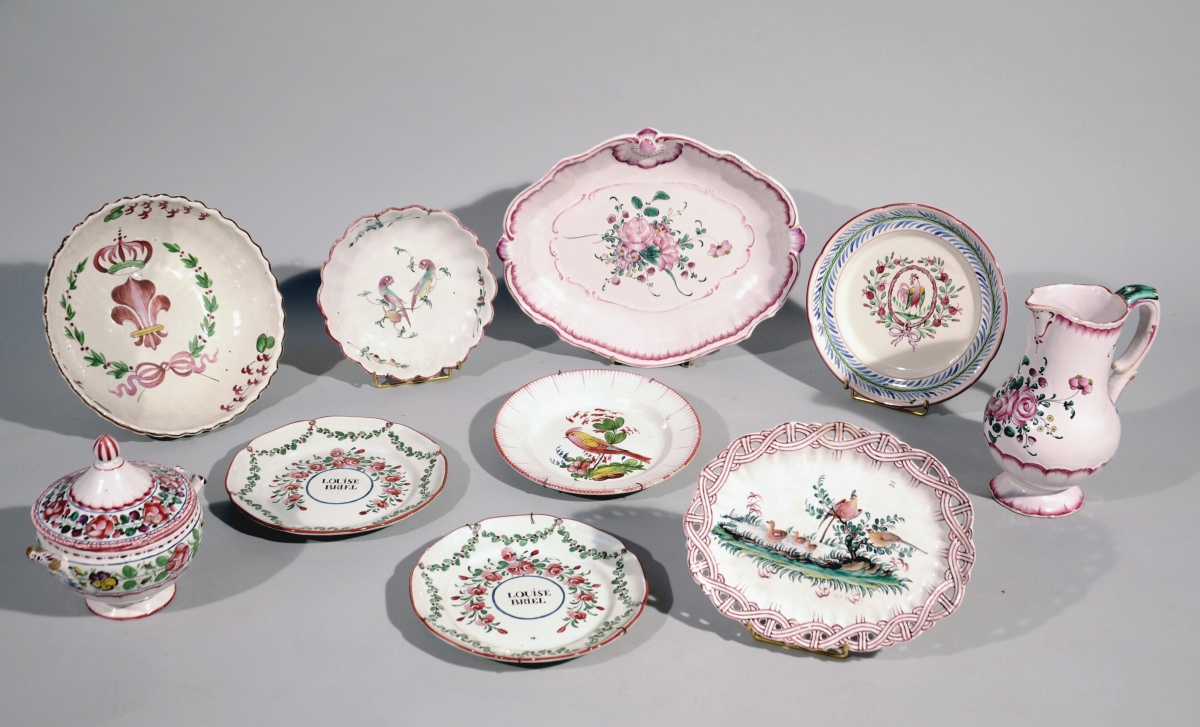 EST. 10 PIÈCES en faïence : un pichet ballustre (haut. 24 cm), un saladier à fleur de lys couronnée (diam. 27,5 cm), un plat oblong (diam. 36,5), une assiette à décor de perroquet, une paire d'assiettes patronymiques, un assiette ai coq, une assiette avec un oiseau, un petit pot-à-oille daté au dessous 1836 et un petit plat à décor d'oiseaus branchés.
