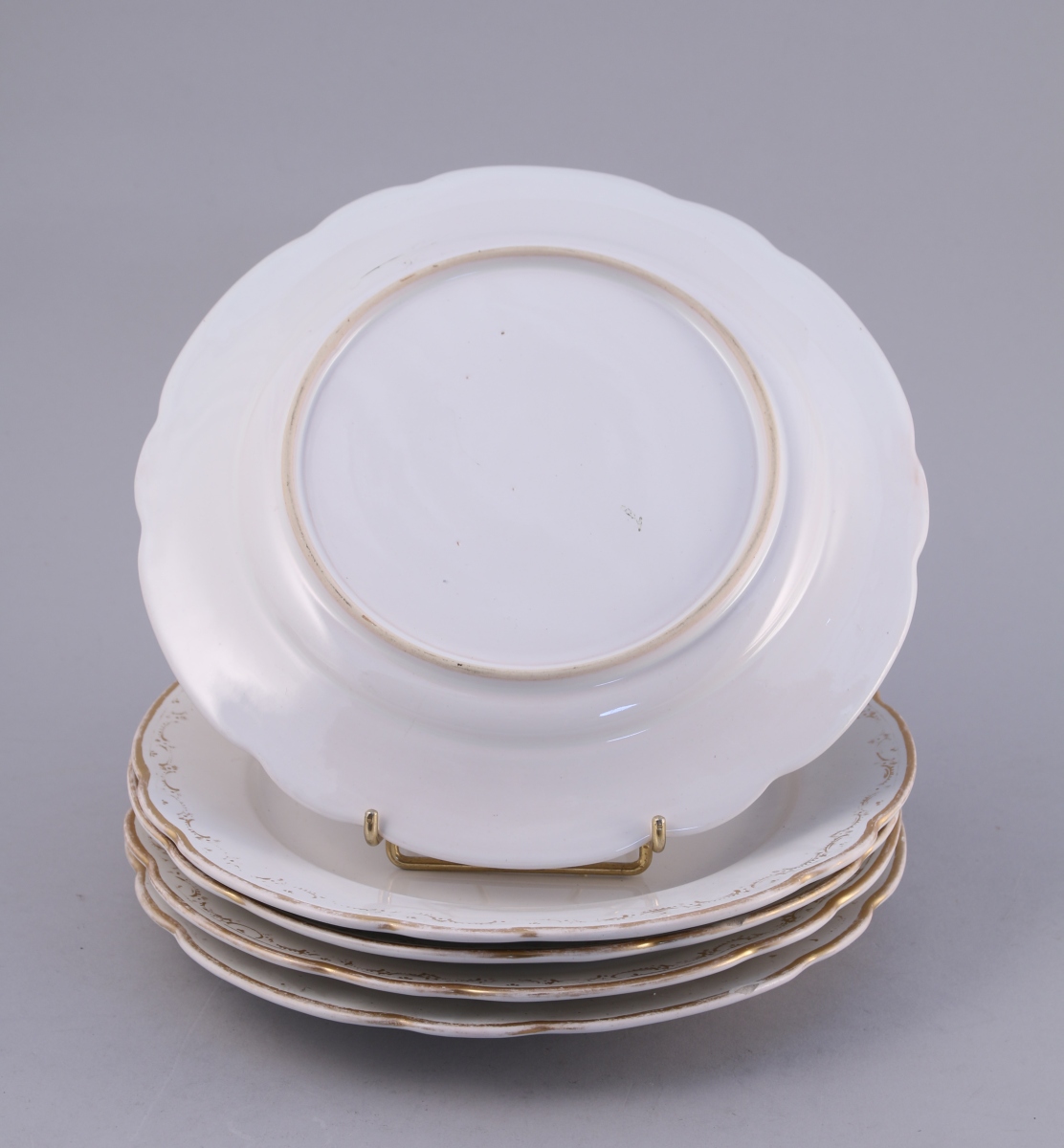 SAINT-CLÉMENT, faïence fine. CINQ ASSIETTES PLATES à fond blanc. Bordure à guirlande rocaille traitée en dorure.