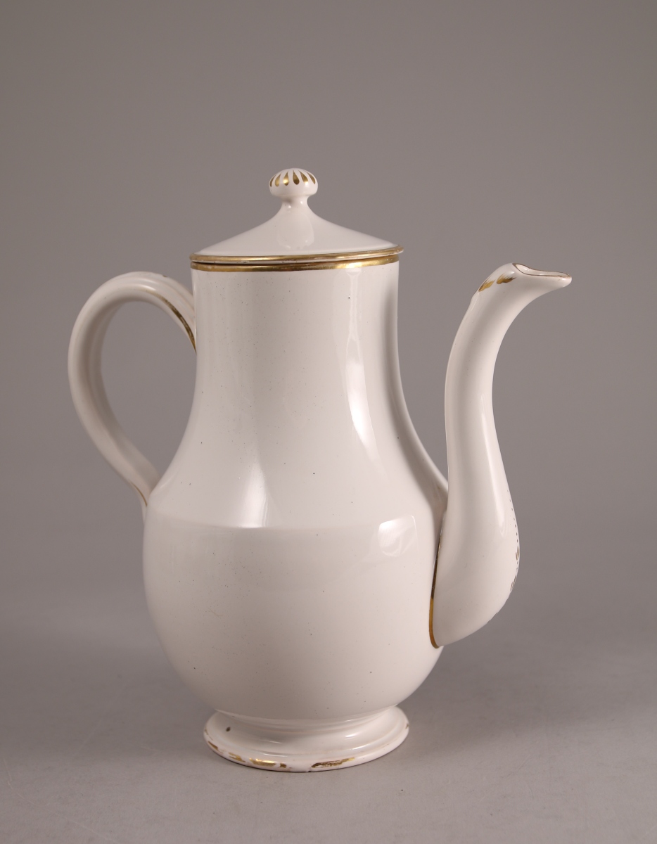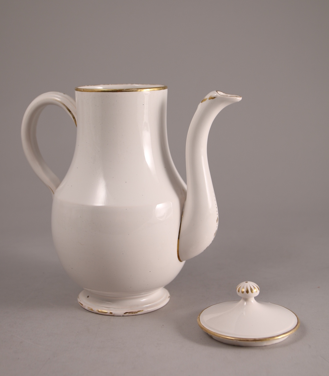 SAINT-CLÉMENT, faïence fine. CAFETIÈRE couverte. Fond blanc à rehauts or.