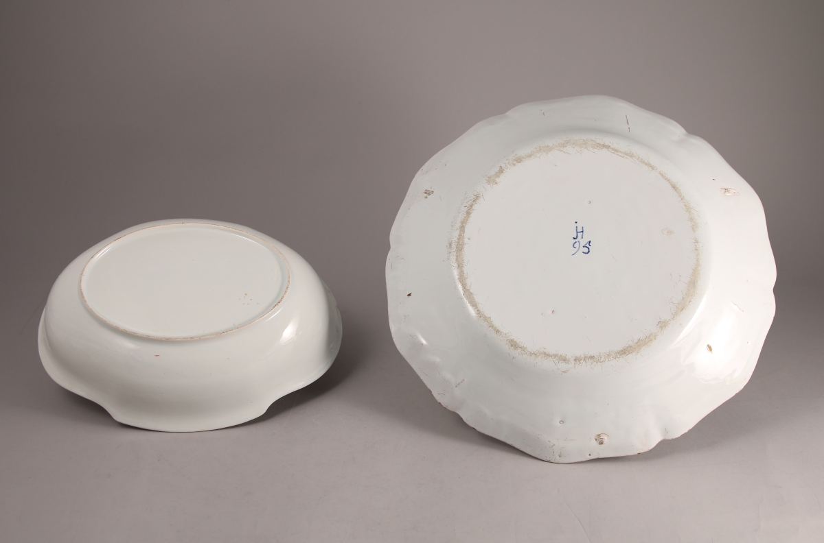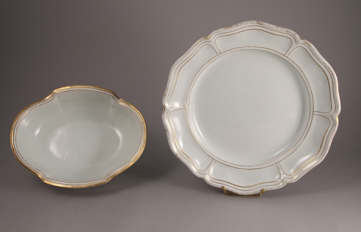 SAINT-CLÉMENT, faïence fine. PLAT et BASSIN à fond blanc et rehauts or.