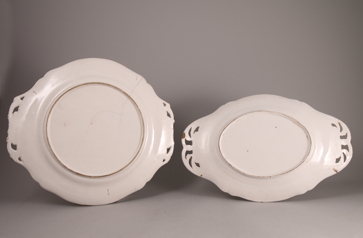SAINT-CLÉMENT, faïence fine. DEUX PRÉSENTOIRS à décor de bouquets de fleurs traités à l'or sur fond blanc. Modèles orfèvrerie.