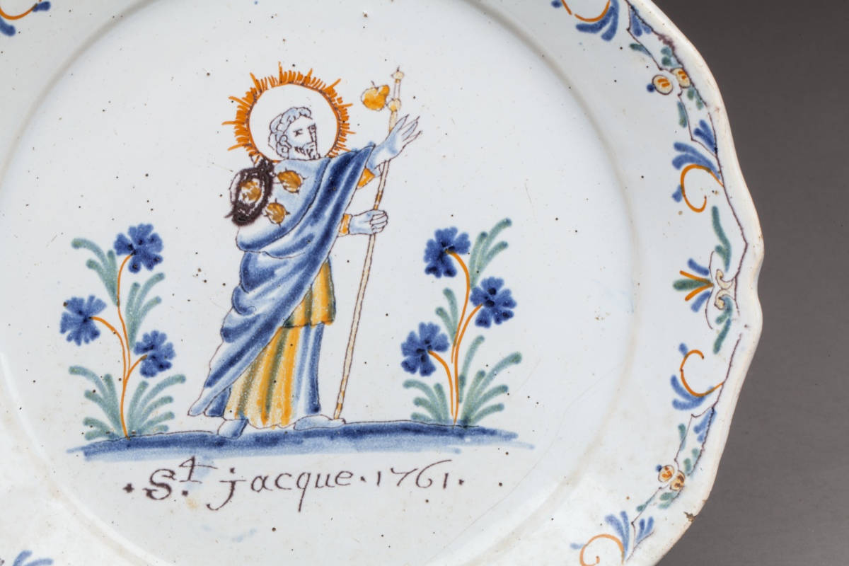 NEVERS, XVIIIe. ASSIETTE en faïence polychrome, patronymique "St. jacque. 1761.".