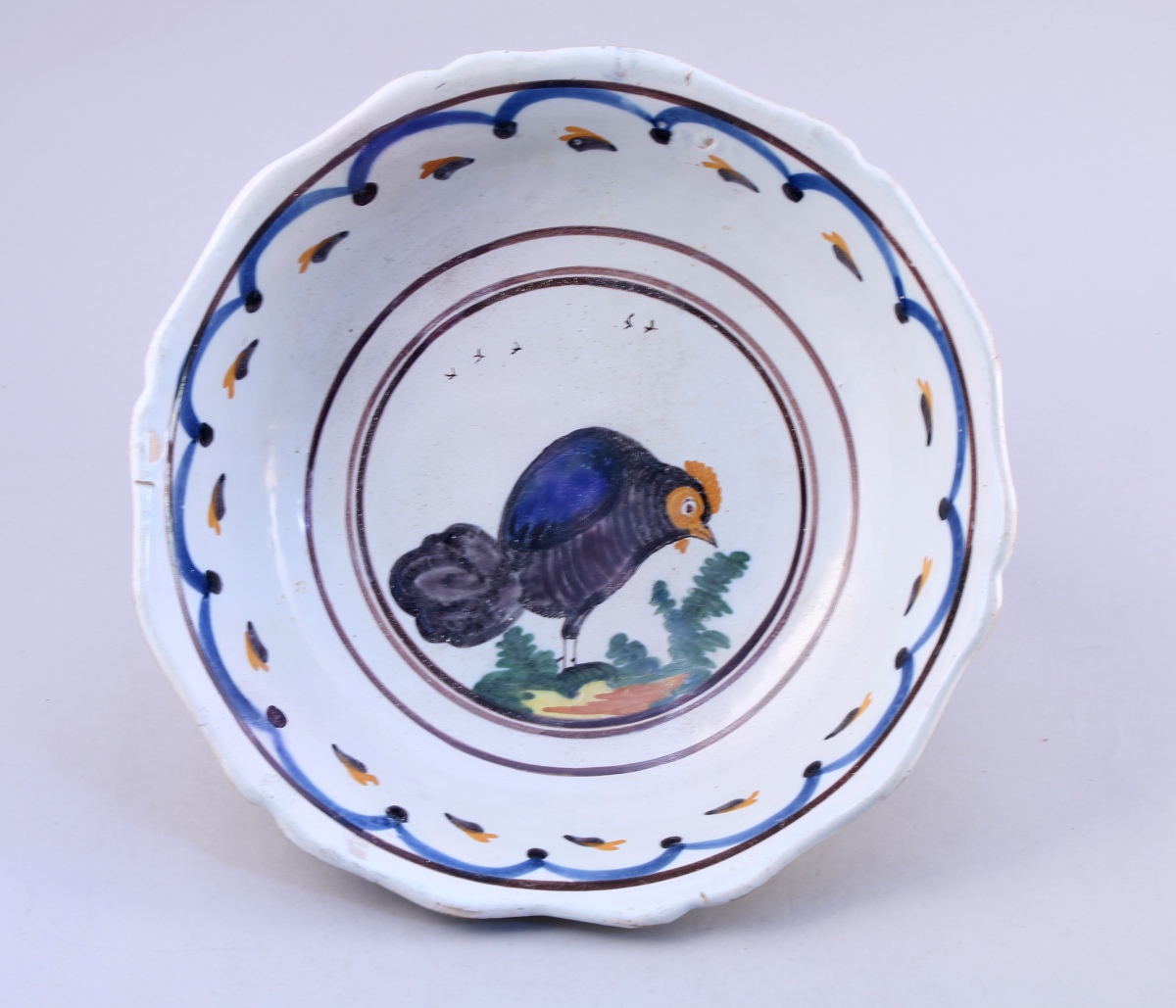 NIVERNAIS, faïence. Grand SALADIER à décor polychrome représentant un coq.