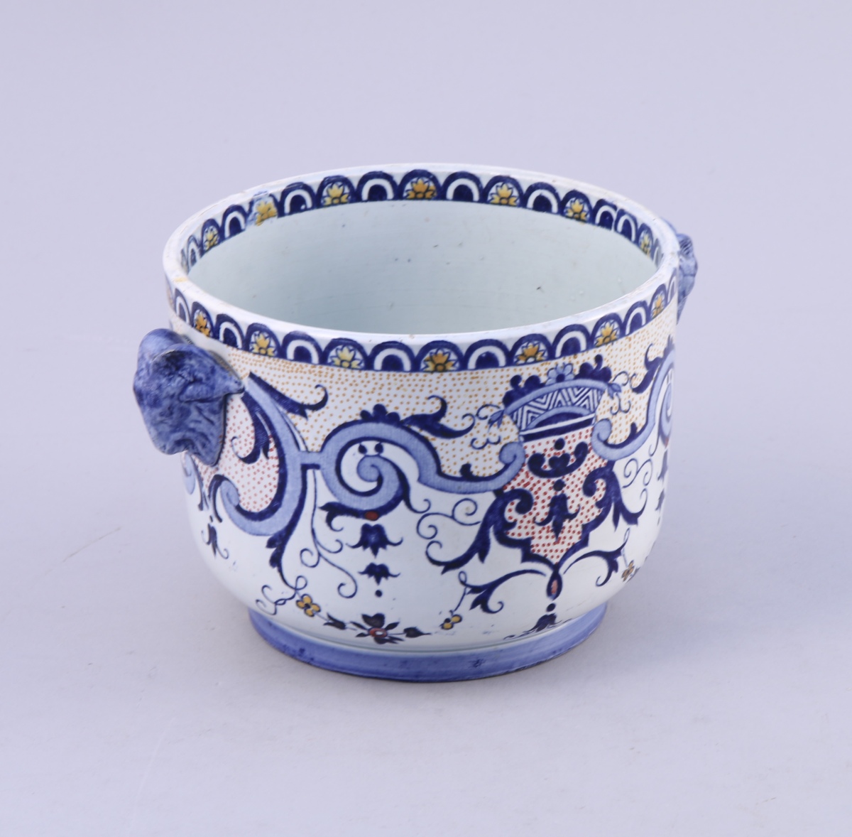GIEN, faïence. CACHE-POT à anses tête de mouflons à décor camaïeux bleu.