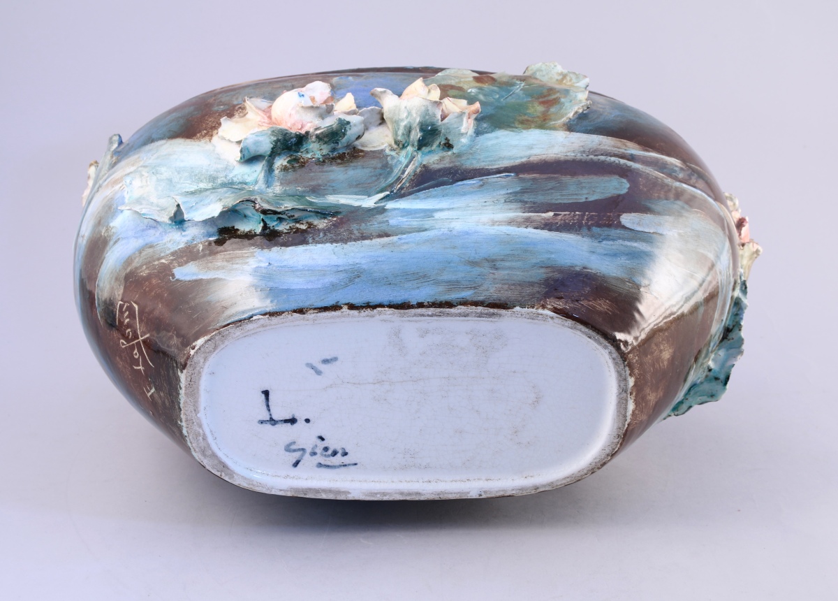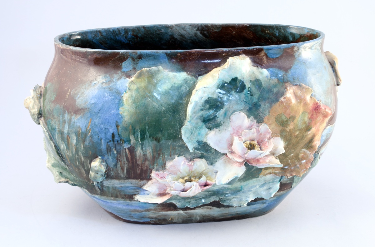GIEN, Félix LAFOND, atelier de Dominique GRENET. JARDINIÈRE de forme oblongue en barbotine à décor polychrome dit impressionniste sous couverte craquelée. Décor appliqué en fort relief de fleurs et feuilles de nymphéas. Signé "F. Lafond" dans le décor et Gien sous la base.