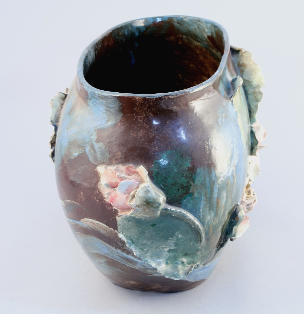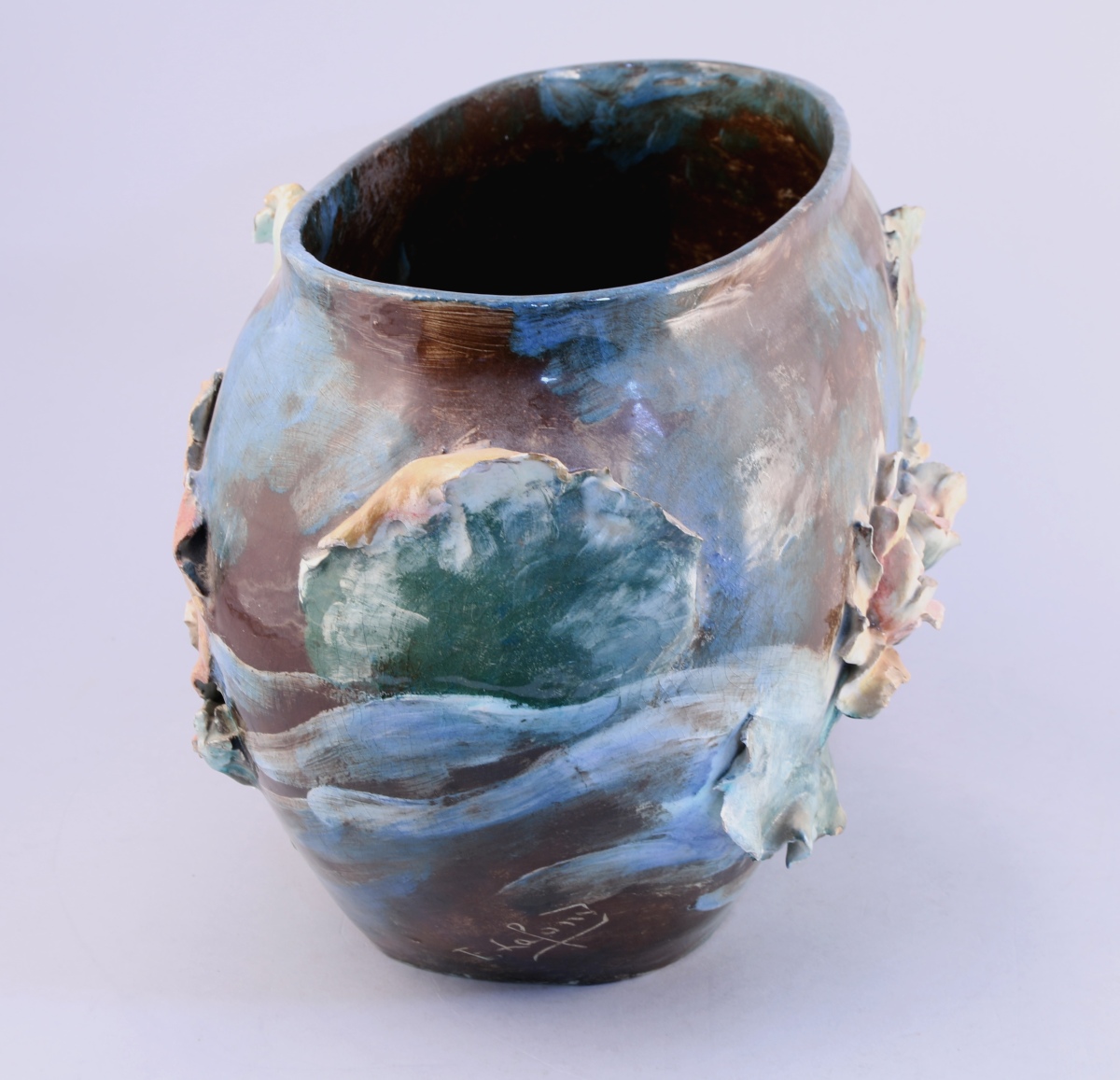 Avec un tel décor, comment ne pas penser aux nymphéas de Claude Monet ? Le terme de "barbotine impressionniste" prend tout son sens avec ce décor que nous devons à Félix Lafond (1815-1901). Élève de Cabanel, il expose pour la première fois au Salon de 1836. Portraitiste de talent, il est également remarqué pour ses compositions florales et ses chiens. Il exerce comme peintre-décorateur à Bourg-la-Reine, puis chez Haviland à partir de 1875, et enfin aux côtés de Dominique Grenet à Gien. Il y réalise des barbotines artistiques. On lui doit en partie "la création du procédé de décor à la barbotine de grand feu sous émail", dit "procédé Laurin", que Grenet améliorera. Ainsi, il réalise "des barbotines originales en fort relief à décors de fleurs", à l'image de notre jardinière. Elle est à rapprocher de deux vases reproduits à la page 18 de l'ouvrage cité en référence.