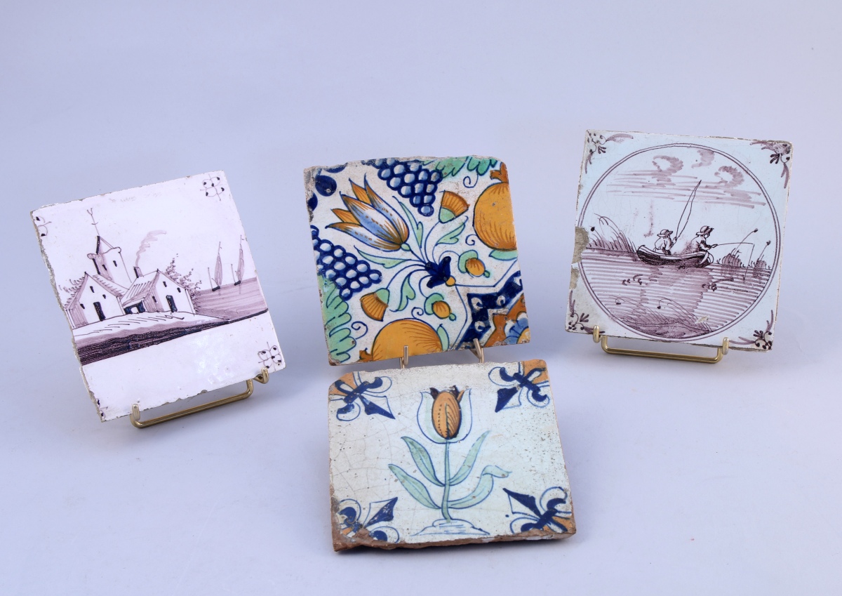 QUATRE CARREAUX, deux polychromes, deux mangannèse, à décor de paysages et de fleurs.