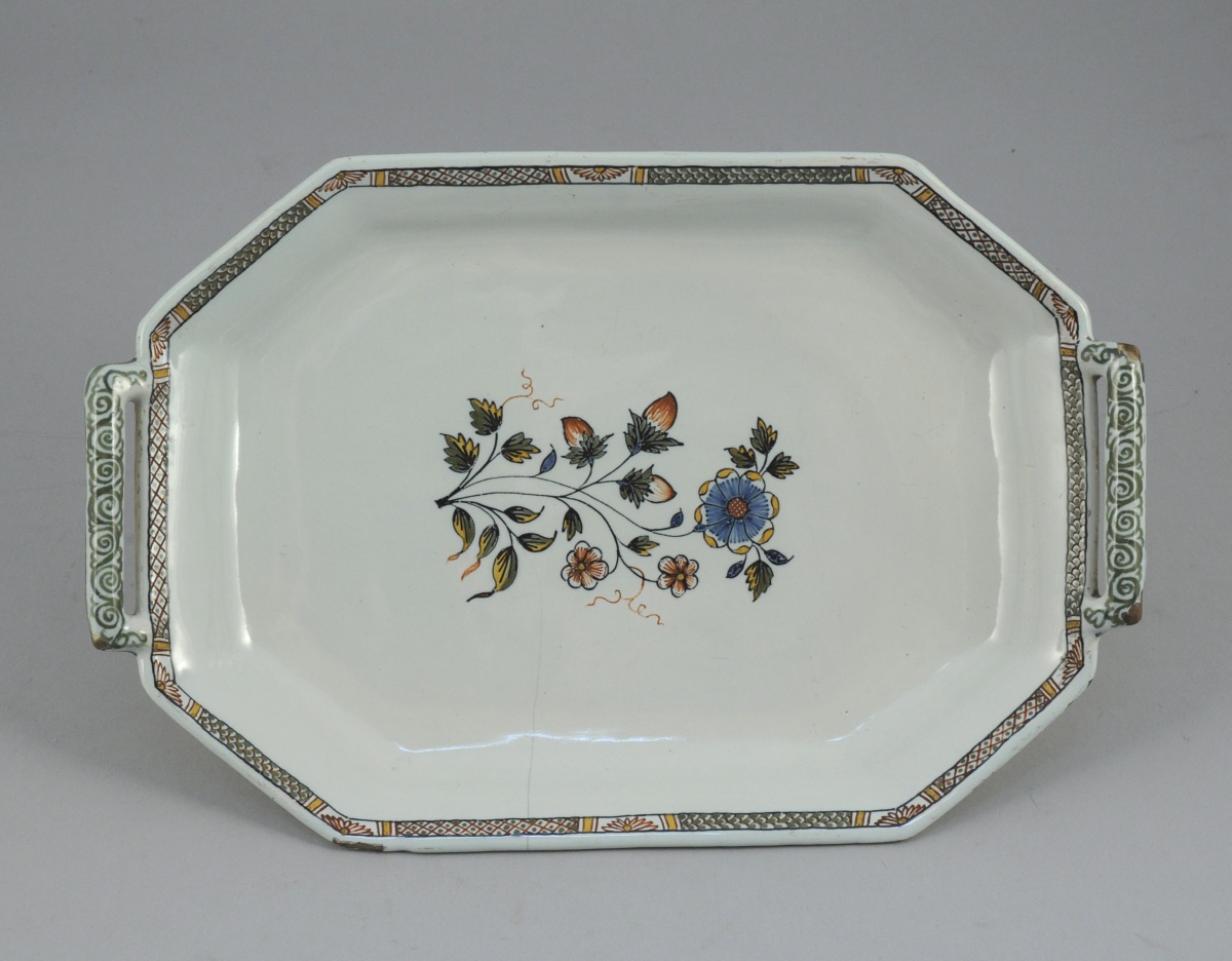 ROUEN. BANNETTE rectangulaire à pans en faïence à décor polychrome floral, anses latérales à motifs de volutes.