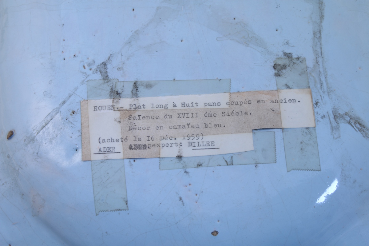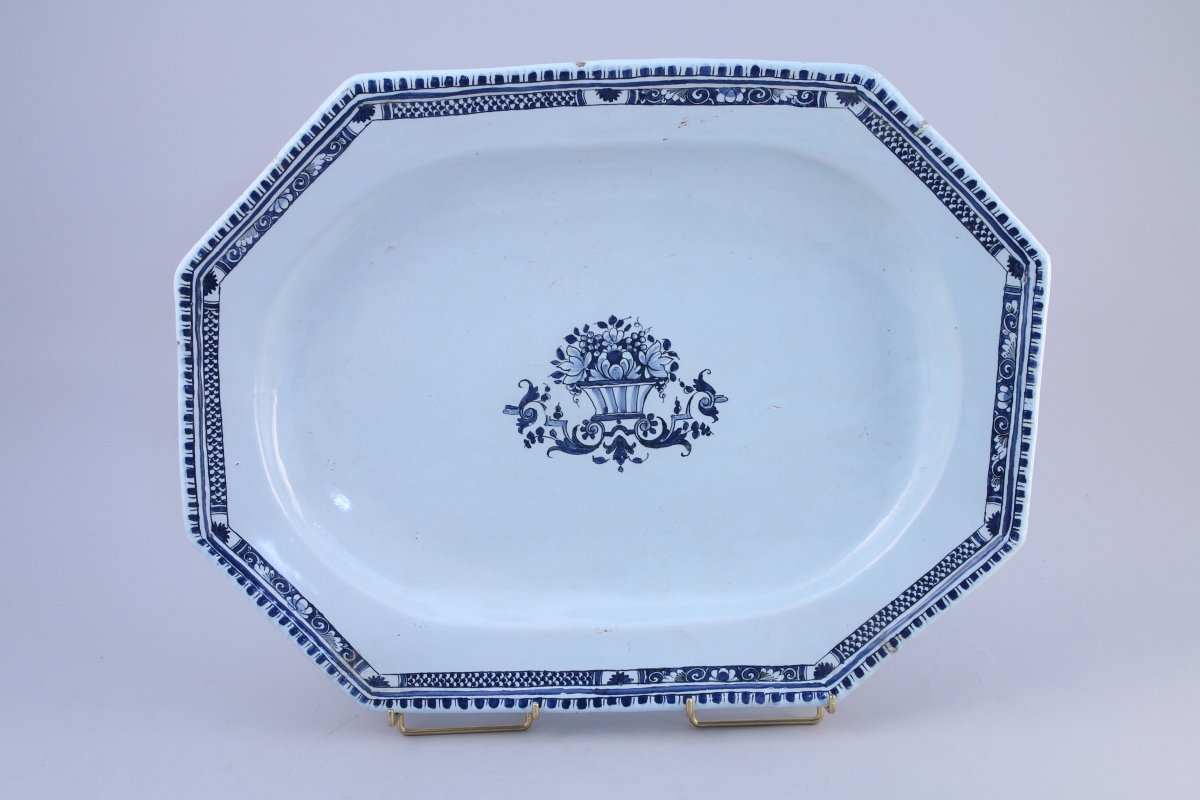 ROUEN. PLAT long à viande à huit pans coupés. Décor en camaïeux bleu. En son centre, panier fleuri.