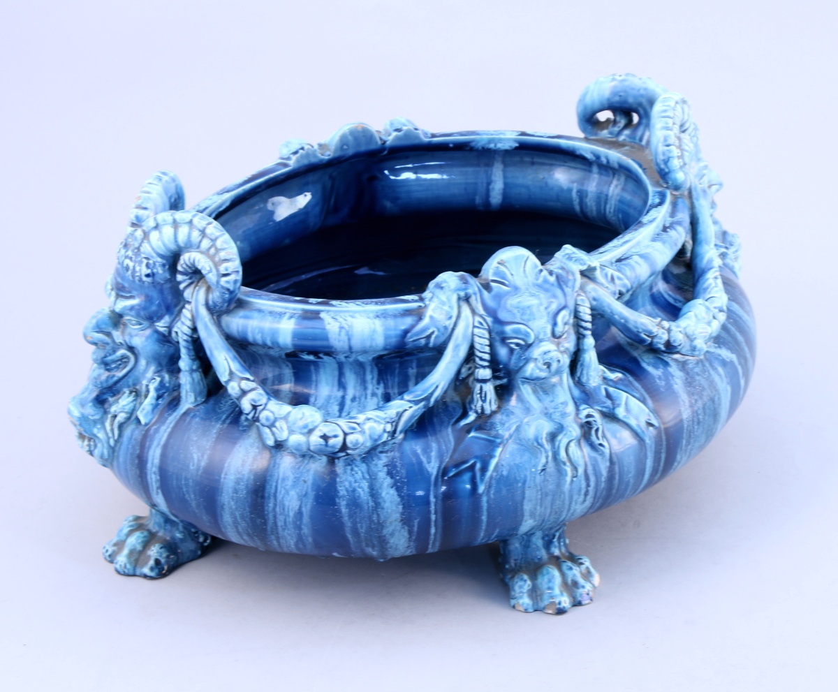 JARDINIÈRE de forme ovale en faïence reposant sur quatre pieds griffes. Fond bleu jaspé. Têtes de faunes et mascarons.