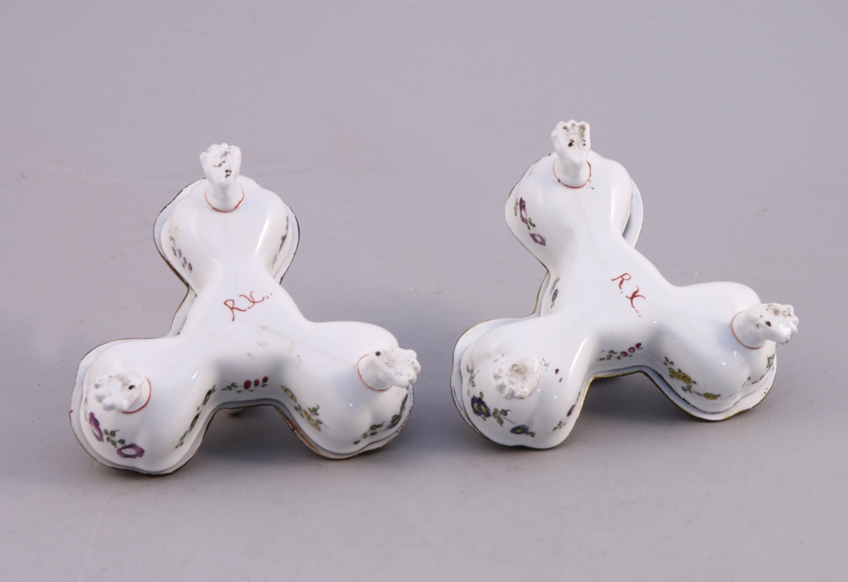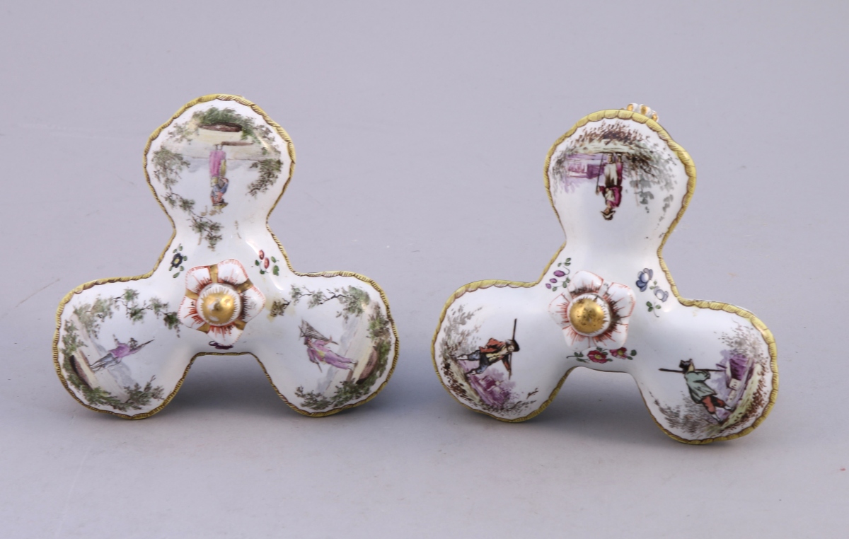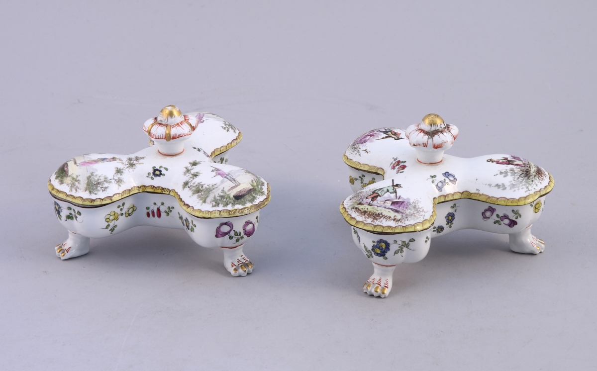 MARSEILLE, faïence, dans le goût de. Paire de BOÏTES À ÉPICES de forme hélicoïdale à décor polychrome de personnages sur fond paysagé.