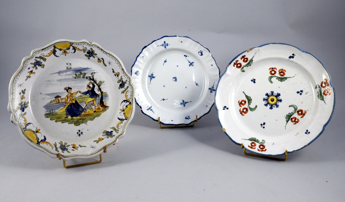 MIDI. TROIS ASSIETTES en faïence à bords chantournés :