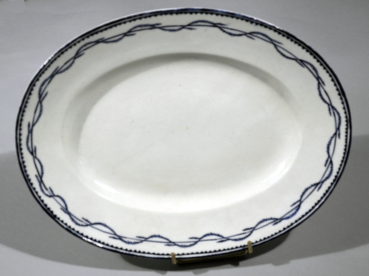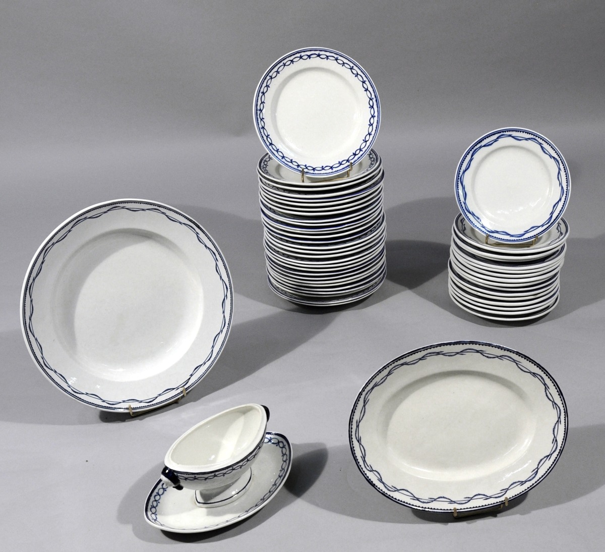 VIEUX TOURNAI. Partie de SERVICE DE TABLE en faïence, 52 pièces, à décor en camaïeu bleu dit "à la chenille", double filet avec frise de dents de loup. Il se compose de 29 assiettes plates, 16 assiettes à dessert, un grand plat rond, un plat ovale et une saucière et son plateau adhérent.