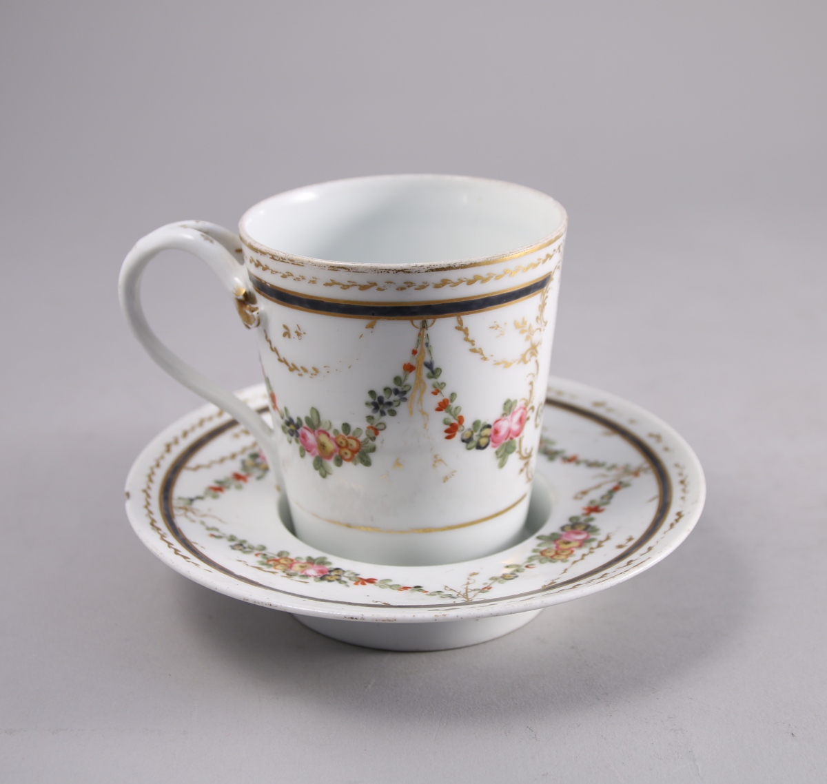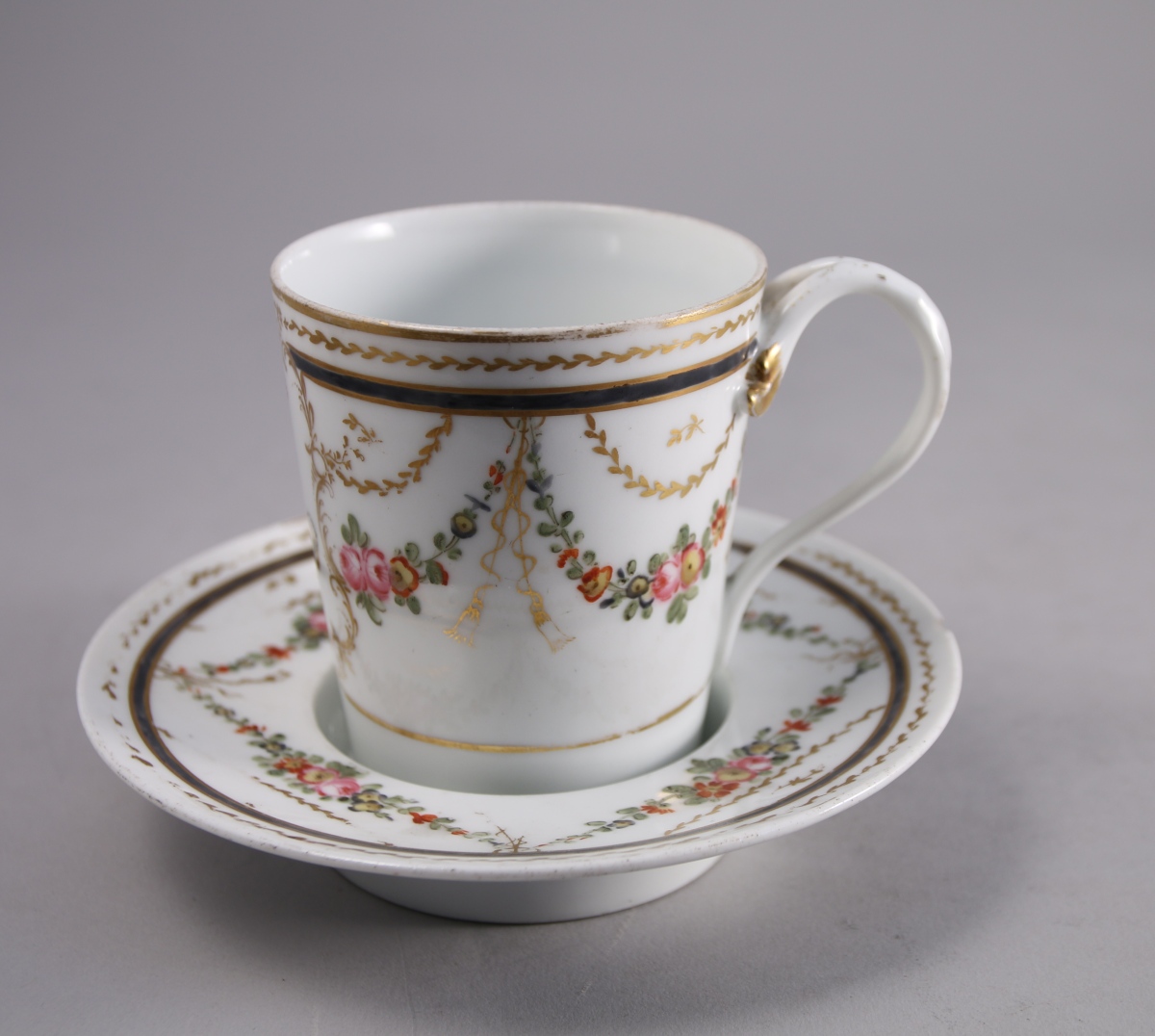 Tasse : Haut. 12, Soucoupe : Diam. 17 cm. (manque le couvercle, usures à la dorure accidents)