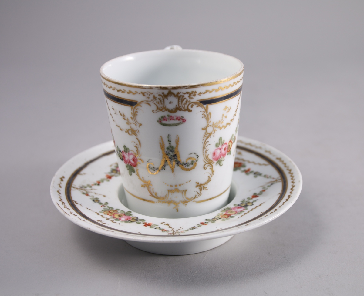 PARIS. PORCELAINE "À LA REINE". TASSE TREMBLEUSE et sa SOUCOUPE à décor polychrome et or de guirlandes de fleurs et feuillages, au monogramme de la Reine : "MA" couronné de fleurs au centre d'un cartouche rocaille en dorure.