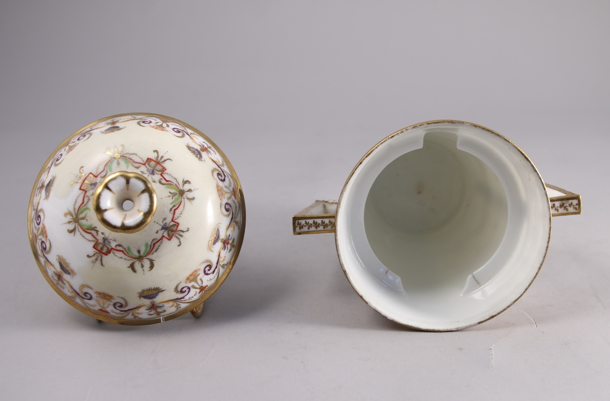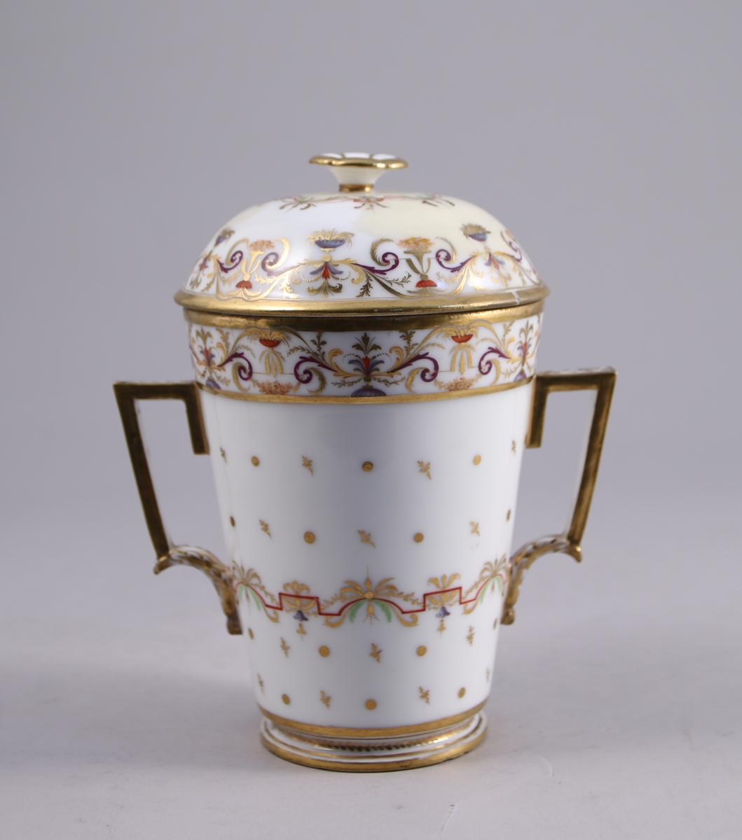 PARIS. RÉCIPIENT cylindrique légèrement évasé à deux anses et son COUVERCLE en porcelaine polychrome rehaussée à l'or.